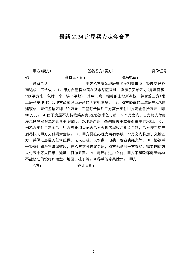 甲方(卖方):_________________签名乙方(买方):_________________ 身份证号码:_________________身份证号码:_________________ 联系电话:_________________联系电话:_________________ 甲方乙方就某地房屋买卖相关事项,经过友好协商达成一下协议 。1、甲方自愿将坐落在某市某区某地一座房子买给乙方(房屋面积130平方米,包括一个一块小平地),其中与房产相关的土地所有权一并卖给乙方(附上房产复印件) 2、甲方必须保证房产的所有权清楚。 3、双方协议的上述房屋及相关建筑总共壹佰叄拾万即130万元,在签订合同后乙方需要支付甲方定金叄拾万元,即30万元。 4、由于房屋不支持按揭买卖,在协议书签订后2个月之内,乙方将支付房屋总额除定金之外的所有金额5、办理房产的一些列相关手续费都由甲方承担。 6、当乙方支付了定金后,甲方需要积极配合乙方办理房屋过户相关手续,乙方接手房产后尽快向甲方支付剩余金额。 7、甲方要在办理完所有手续一个月之内将房子交给乙方,并保证房屋无任何担保,无人出租。无水费、电费、物业费拖欠等。 8、协议书一经签订即产生法律效应,在乙方支付过定金后,双方无论哪一方毁约,需要向对方支付五十万人民币,逾期一日加五百。 9、房屋在过户之前,甲方不得毁坏房屋结构、不能移动的设施如墙壁、地面、柱子等。可移动的家具除外。 甲方:_________________乙方:_________________ 签订日期:_________________