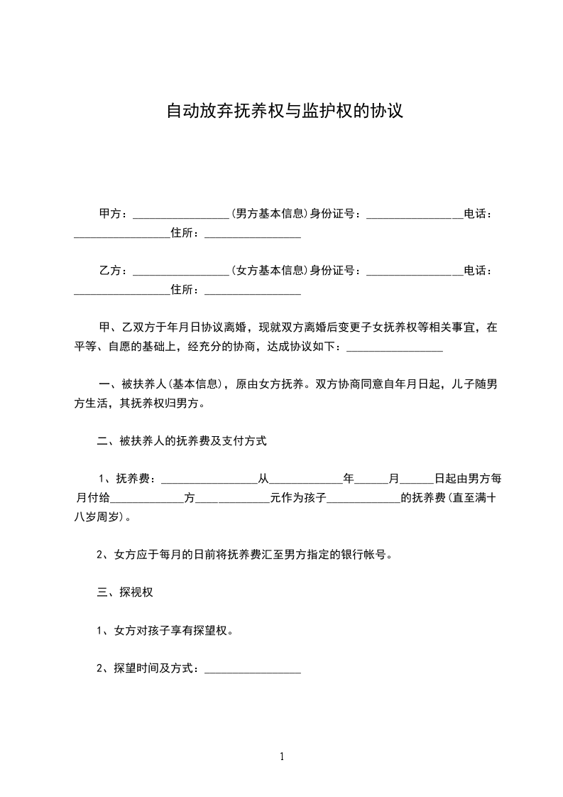 乙方:_________________(女方基本信息)身份证号:_________________电话:_________________住所:_________________