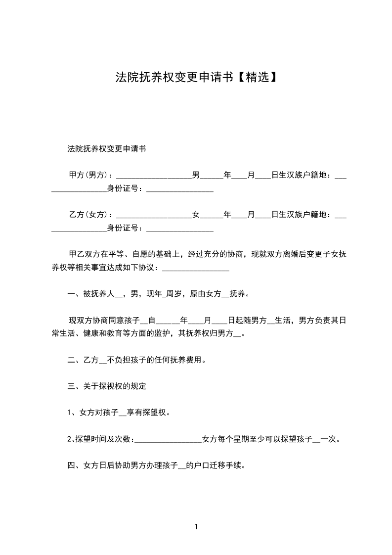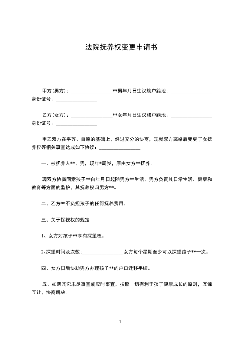 甲乙双方在平等、自愿的基础上,经过充分的协商,现就双方离婚后变更子女抚养权等相关事宜达成如下协议:_________________