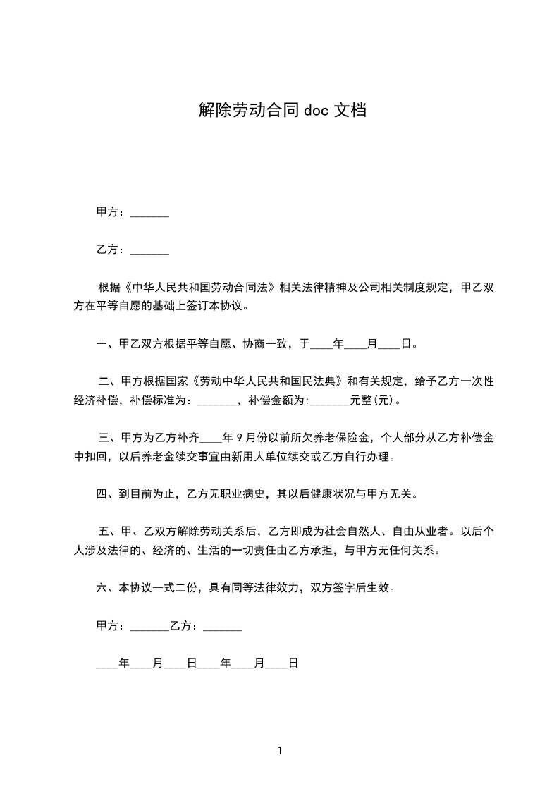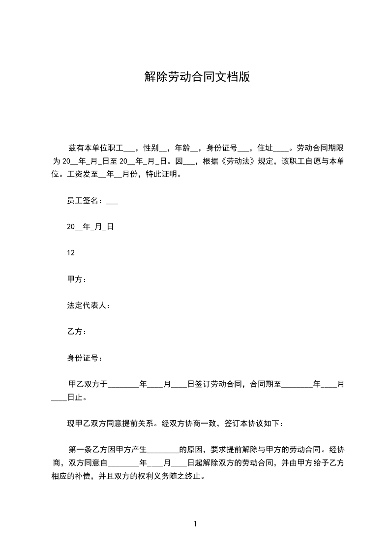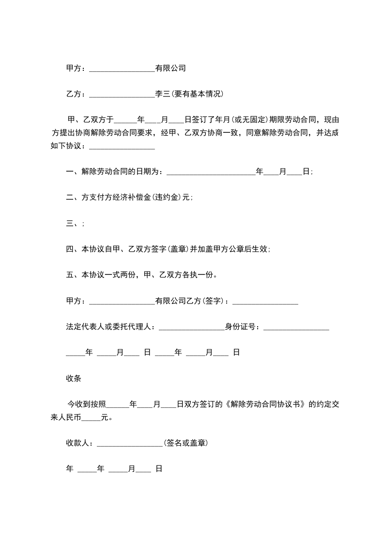 甲、乙双方于______年____月____日签订了年月(或无固定)期限劳动合同,现由方提出协商解除劳动合同要求,经甲、乙双方协商一致,同意解除劳动合同,并达成如下协议:_________________