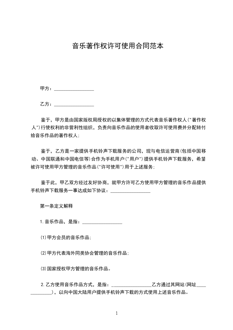 鉴于此,甲乙双方经过友好协商,就甲方许可乙方使用甲方管理的音乐作品提供手机铃声下载服务一事达成如下协议:_________________