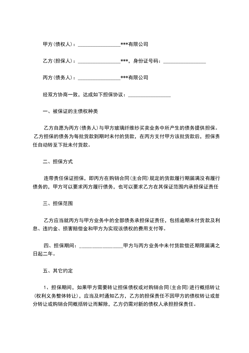 乙方自愿为丙方(债务人)与甲方玻璃纤维纱买卖业务中所产生的债务提供担保。乙方担保的债务为每批货款到期时未付的货款,在丙方支付甲方该批货款后,担保责任自动转至下批未付货款。