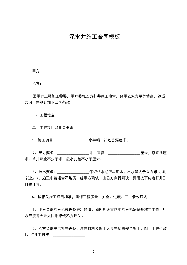 因甲方工程施工需要,甲方委托乙方打井施工事宜,经甲乙双方平等协商,达成共识,并签订如下合同条款:_________________