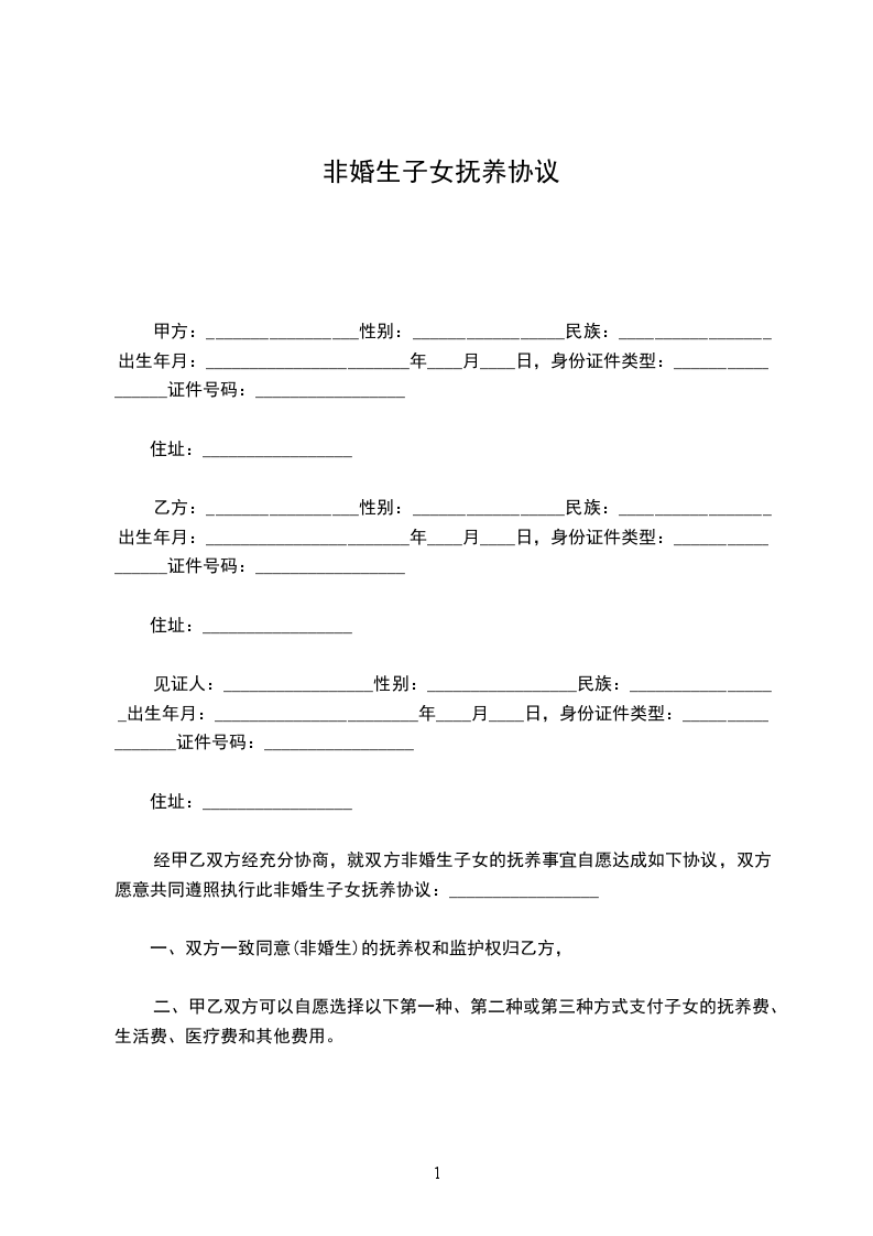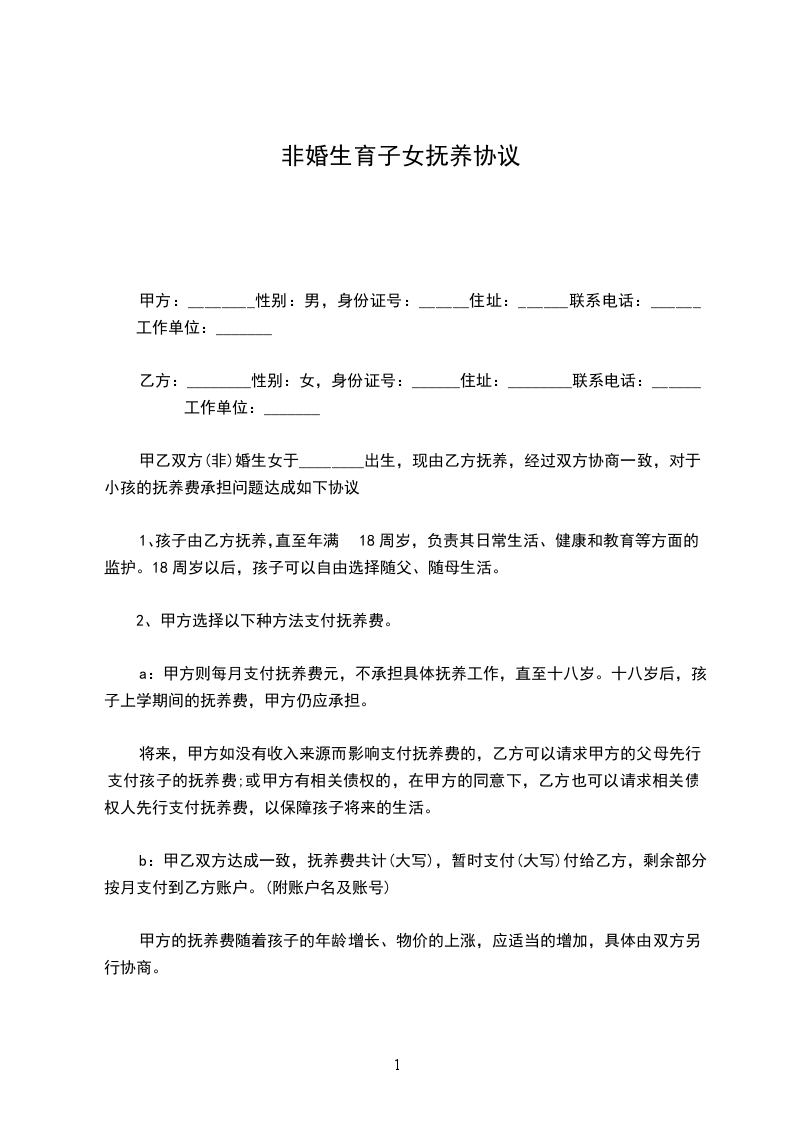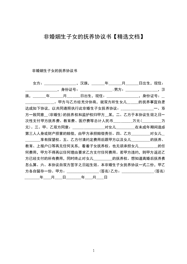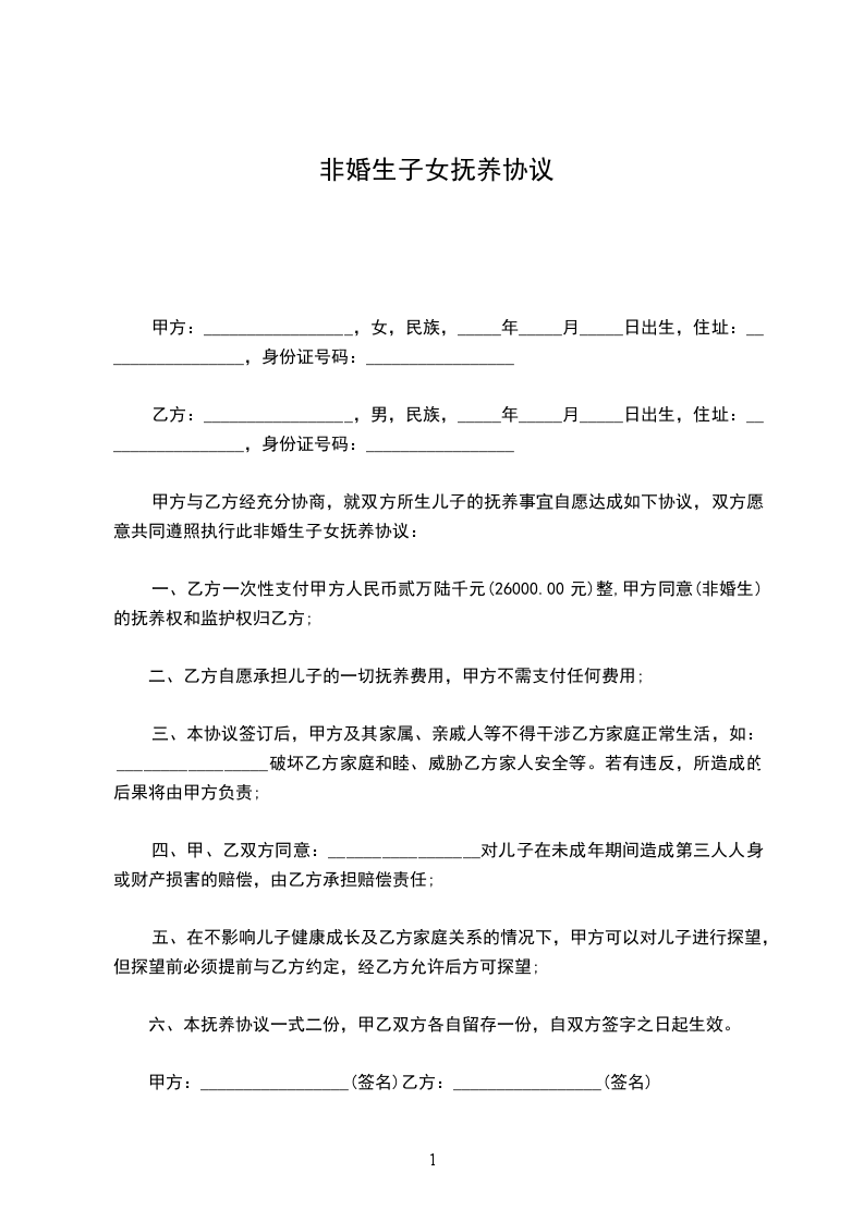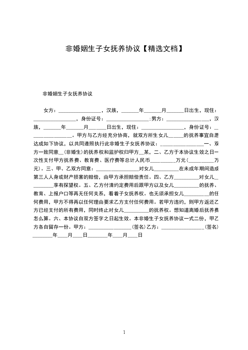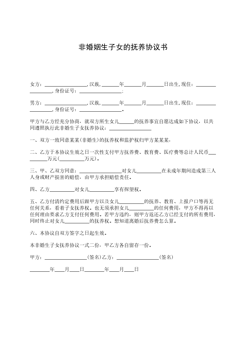 女方:_________________,汉族,_______年_______月_______日出生,现住:_________________,身份证号:_________________; 男方:_________________,汉族,_______年_______月_______日出生,现住:_________________,身份证号:_________________。 甲方与乙方经充分协商,就双方所生女儿______的抚养事宜自愿达成如下协议,以共同遵照执行此非婚生子女抚养协议:_________________ 一、双方一致同意某某(非婚生)的抚养权和监护权归甲方某某某, 二、乙方于本协议生效之日一次性支付甲方抚养费、教育费、医疗费等总计人民币__________万元(__________万元)。 三、甲、乙双方同意:_________________对女儿__________在未成年期间造成第三人人身或财产损害的赔偿,由甲方承担赔偿责任。 四、乙方__________对女儿__________享有探望权。 五、乙方付清约定费用后跟甲方以及女儿__________的抚养、教育、上报户口等再无任何关系,看着子女抚养权。也无须承担女儿__________的任何费用,甲方不得再以任何理由要求乙方支付任何费用。若甲方违约,则甲方返还乙方已经支付的所有费用,同时终止对女儿__________的抚养权。想知道离婚后抚养费怎么算。 六、本协议自双方签字之日起生效。 本非婚生子女抚养协议一式二份,甲乙方各自留存一份。 甲方:_________________(签名)乙方:_________________(签名) ________年____月____日________年____月____日