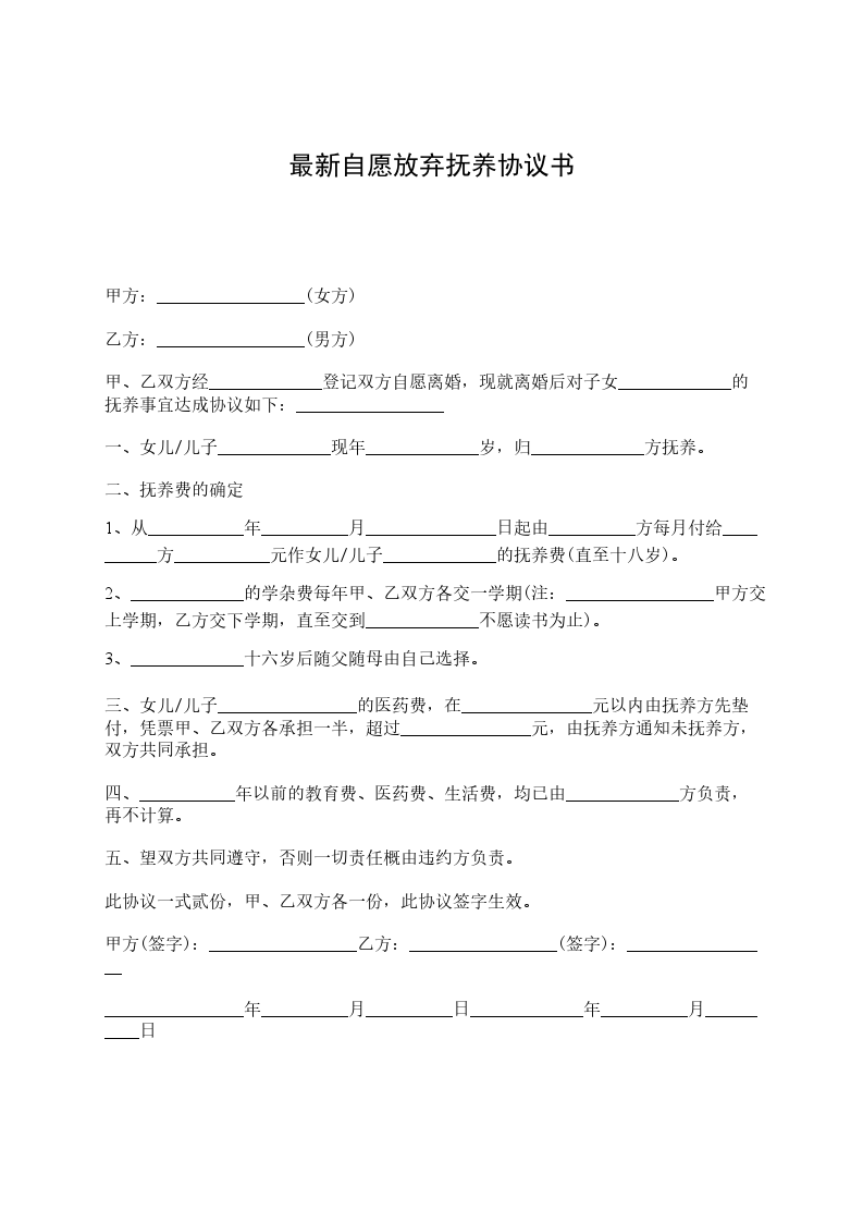 甲方:_________________(女方) 乙方:_________________(男方) 甲、乙双方经_____________登记双方自愿离婚,现就离婚后对子女_____________的抚养事宜达成协议如下:_________________ 一、女儿/儿子_____________现年_____________岁,归_____________方抚养。 二、抚养费的确定 1、从___________年__________月_______________日起由__________方每月付给__________方___________元作女儿/儿子_____________的抚养费(直至十八岁)。 2、_____________的学杂费每年甲、乙双方各交一学期(注:_________________甲方交上学期,乙方交下学期,直至交到_____________不愿读书为止)。 3、_____________十六岁后随父随母由自己选择。 三、女儿/儿子________________的医药费,在_______________元以内由抚养方先垫付,凭票甲、乙双方各承担一半,超过_______________元,由抚养方通知未抚养方,双方共同承担。 四、___________年以前的教育费、医药费、生活费,均已由_____________方负责,再不计算。 五、望双方共同遵守,否则一切责任概由违约方负责。 此协议一式贰份,甲、乙双方各一份,此协议签字生效。 甲方(签字):_________________乙方:_________________(签字):_________________ ________________年__________月__________日_____________年__________月__________日