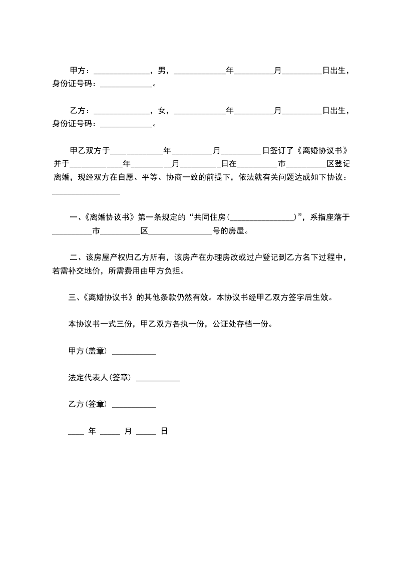 一、《离婚协议书》第一条规定的“共同住房(________________)”,系指座落于__________市__________区________________号的房屋。