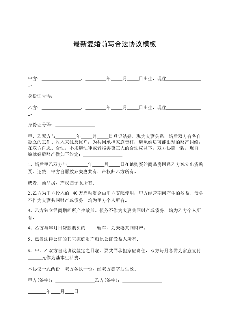 甲方:_________________,_________年_____月_____日出生,现住________________。 身份证号码:_________________ 乙方:_________________,_________年_____月_____日出生,现住________________。 身份证号码:_________________ 甲、乙双方与_________年_____月_____日登记结婚,现为夫妻关系,婚后双方有各自独立的工作、收入来源及账户,为共同承担家庭责任,避免婚后可能出现的财产纠纷,在双方自愿、合法,不规避法律或者损害第三人的合法权益下,双方协商一致,现自愿就婚后财产做如下约定:_________________ 1、婚后甲乙双方与_________年_____月_____日在地购买的商品房因系乙方独立出资购买、还贷,甲方自愿放弃夫妻共有,产权归乙方所有。 或者:商品房,产权归子女所有。 2、乙方为甲方投入的40万启动资金由甲方支配使用,甲方经营期间产生的效益、债务不作为夫妻共同财产或债务,均为甲方个人所有。 3、乙方独立经商期间所产生效益、债务不作为夫妻共同财产或债务,均为乙方个人所有。 4、乙方与_____年_____月_____日贷款购买的_____轿车,为夫妻共同财产。 5、已做法律公证的其它家庭财产归原公证受益人所有。 6、甲、乙双方自此协议签定之日起,要共同承担家庭责任,双方每月各需为家庭支付______元作为基本生活费。 本协议一式两份,双方各执一份,经双方签字后生效。 甲方(签字):_________________乙方(签字):_________________ ________年____月____日