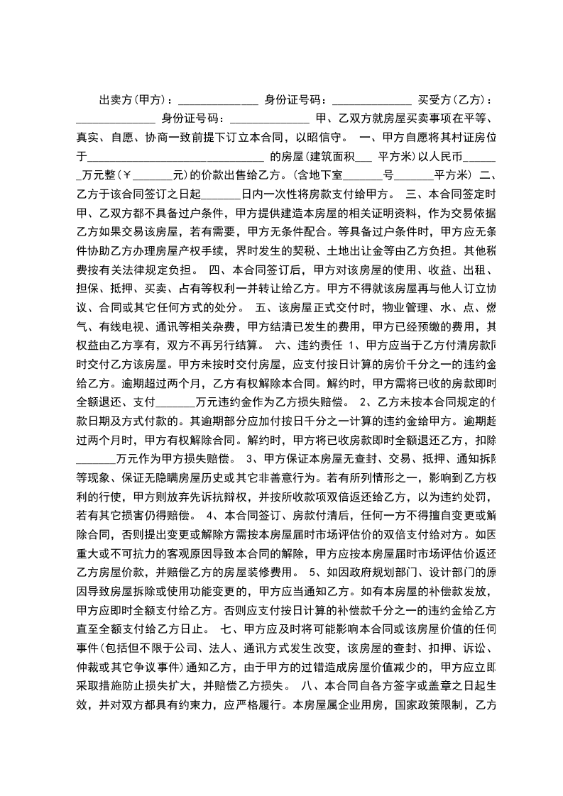 出卖方(甲方):______________ 身份证号码:______________ 买受方(乙方):______________ 身份证号码:______________ 甲、乙双方就房屋买卖事项在平等、真实、自愿、协商一致前提下订立本合同,以昭信守。 一、甲方自愿将其村证房位于_______________________________ 的房屋(建筑面积___ 平方米)以人民币_______万元整(¥_______元)的价款出售给乙方。(含地下室_______号_______平方米) 二、乙方于该合同签订之日起_______日内一次性将房款支付给甲方。 三、本合同签定时,甲、乙双方都不具备过户条件,甲方提供建造本房屋的相关证明资料,作为交易依据。乙方如果交易该房屋,若有需要,甲方无条件配合。等具备过户条件时,甲方应无条件协助乙方办理房屋产权手续,界时发生的契税、土地出让金等由乙方负担。其他税费按有关法律规定负担。 四、本合同签订后,甲方对该房屋的使用、收益、出租、担保、抵押、买卖、占有等权利一并转让给乙方。甲方不得就该房屋再与他人订立协议、合同或其它任何方式的处分。 五、该房屋正式交付时,物业管理、水、点、燃气、有线电视、通讯等相关杂费,甲方结清已发生的费用,甲方已经预缴的费用,其权益由乙方享有,双方不再另行结算。 六、违约责任 1、甲方应当于乙方付清房款同时交付乙方该房屋。甲方未按时交付房屋,应支付按日计算的房价千分之一的违约金给乙方。逾期超过两个月,乙方有权解除本合同。解约时,甲方需将已收的房款即时全额退还、支付_______万元违约金作为乙方损失赔偿。 2、乙方未按本合同规定的付款日期及方式付款的。其逾期部分应加付按日千分之一计算的违约金给甲方。逾期超过两个月时,甲方有权解除合同。解约时,甲方将已收房款即时全额退还乙方,扣除_______万元作为甲方损失赔偿。 3、甲方保证本房屋无查封、交易、抵押、通知拆除等现象、保证无隐瞒房屋历史或其它非善意行为。若有所列情形之一,影响到乙方权利的行使,甲方则放弃先诉抗辩权,并按所收款项双倍返还给乙方,以为违约处罚,若有其它损害仍得赔偿。 4、本合同签订、房款付清后,任何一方不得擅自变更或解除合同,否则提出变更或解除方需按本房屋届时市场评估价的双倍支付给对方。如因重大或不可抗力的客观原因导致本合同的解除,甲方应按本房屋届时市场评估价返还乙方房屋价款,并赔偿乙方的房屋装修费用。 5、如因政府规划部门、设计部门的原因导致房屋拆除或使用功能变更的,甲方应当通知乙方。如有本房屋的补偿款发放,甲方应即时全额支付给乙方。否则应支付按日计算的补偿款千分之一的违约金给乙方,直至全额支付给乙方日止。 七、甲方应及时将可能影响本合同或该房屋价值的任何事件(包括但不限于公司、法人、通讯方式发生改变,该房屋的查封、扣押、诉讼、仲裁或其它争议事件)通知乙方,由于甲方的过错造成房屋价值减少的,甲方应立即采取措施防止损失扩大,并赔偿乙方损失。 八、本合同自各方签字或盖章之日起生效,并对双方都具有约束力,应严格履行。本房屋属企业用房,国家政策限制,乙方是实际产权人和实际所有人,而非合法产权人,故本房屋不灭失,该合同永久有效。 九、合同履行过程中发生争议,由双方当事人协商解决,协商不成的依法向合同签署地人民法院起诉。 十、附件:甲乙双方身份证复印件、该房屋平面设计图。 甲方:______________ 乙方:______________ 联系地址:__________ 联系地址:_________ 联系电话:__________ 联系电话:_________ _______年_______月_______日