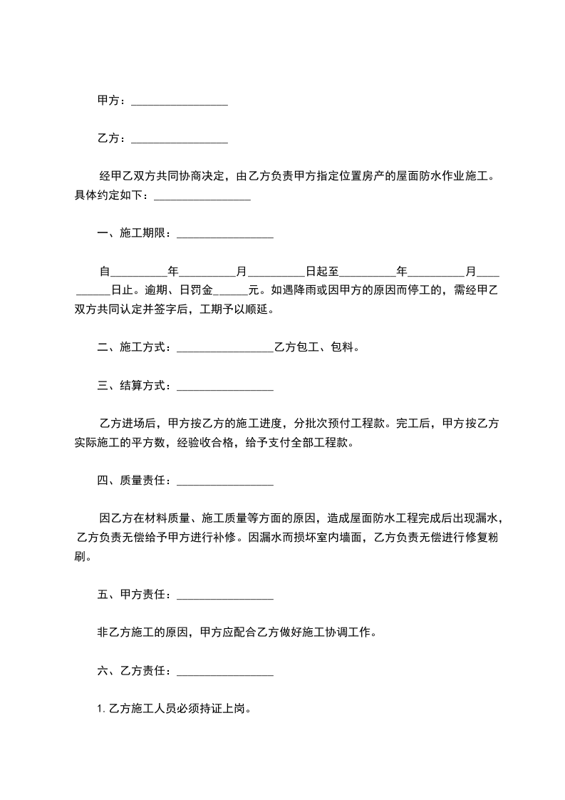 经甲乙双方共同协商决定,由乙方负责甲方指定位置房产的屋面防水作业施工。具体约定如下:_________________