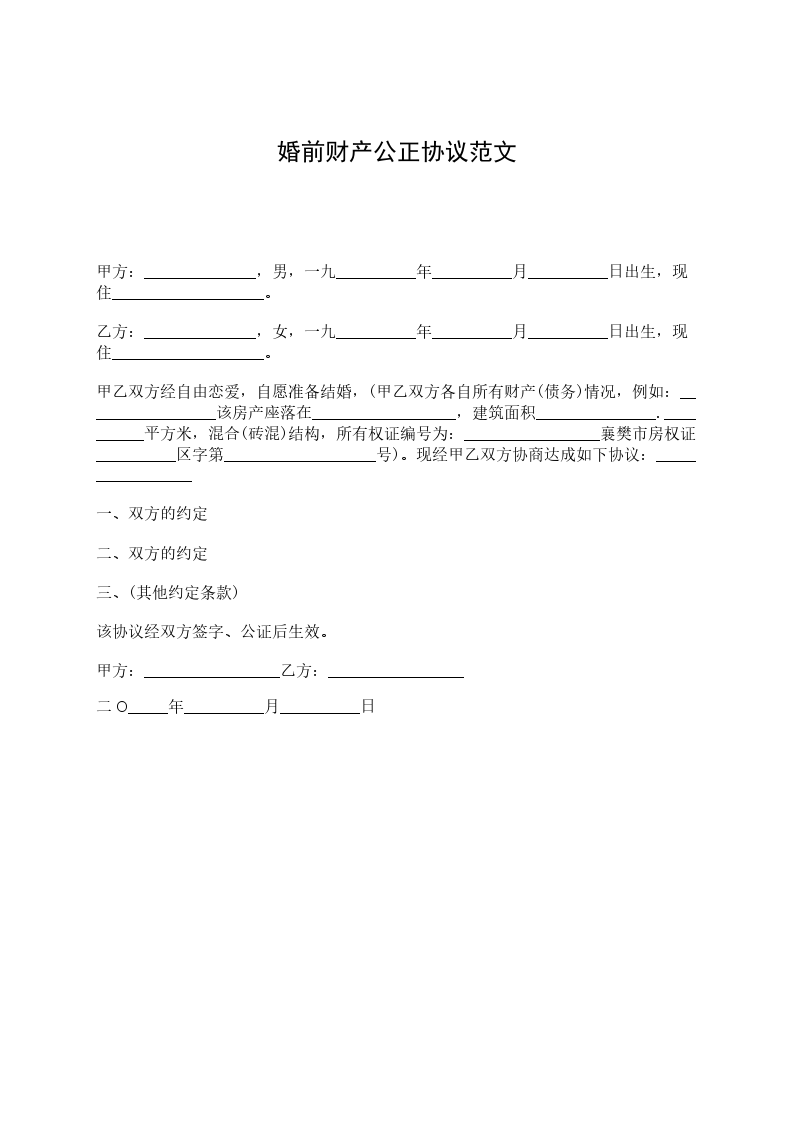 甲方:______________,男,一九__________年__________月__________日出生,现住___________________。 乙方:______________,女,一九__________年__________月__________日出生,现住___________________。 甲乙双方经自由恋爱,自愿准备结婚,(甲乙双方各自所有财产(债务)情况,例如:_________________该房产座落在__________________,建筑面积_______________.__________平方米,混合(砖混)结构,所有权证编号为:_________________襄樊市房权证__________区字第___________________号)。现经甲乙双方协商达成如下协议:_________________ 一、双方的约定 二、双方的约定 三、(其他约定条款) 该协议经双方签字、公证后生效。 甲方:_________________乙方:_________________ 二O_____年__________月__________日