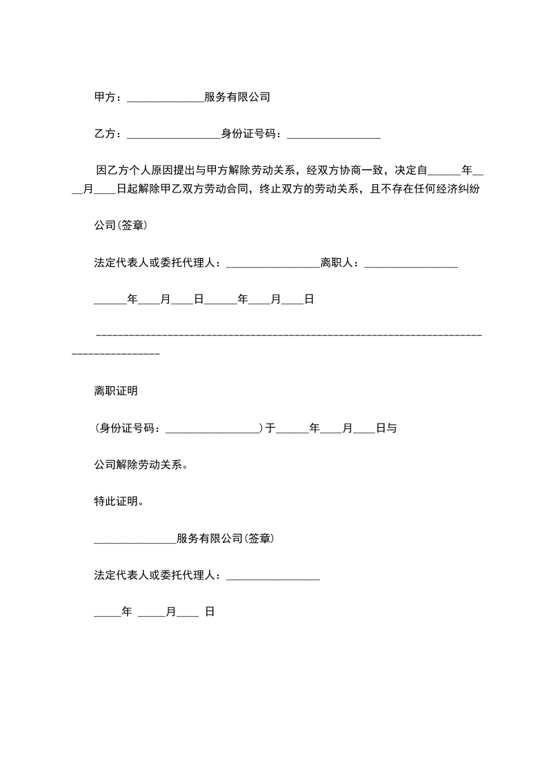 因乙方个人原因提出与甲方解除劳动关系,经双方协商一致,决定自______年____月____日起解除甲乙双方劳动合同,终止双方的劳动关系,且不存在任何经济纠纷。