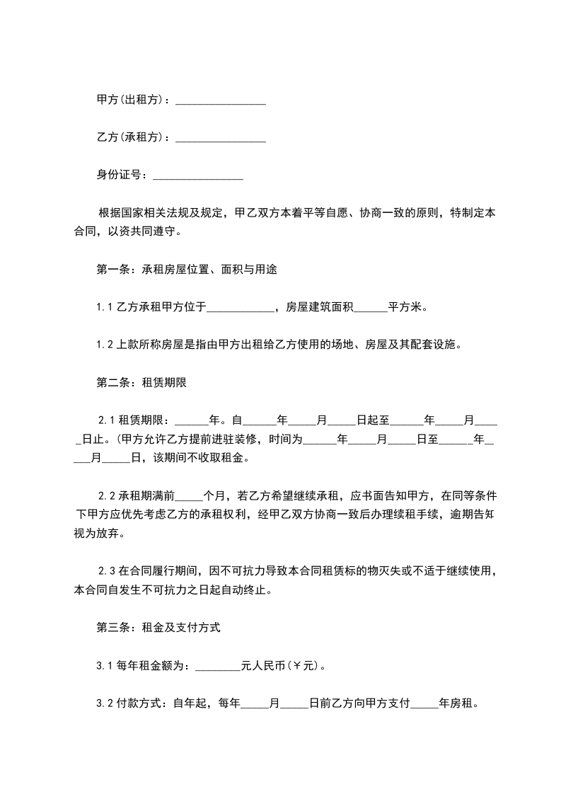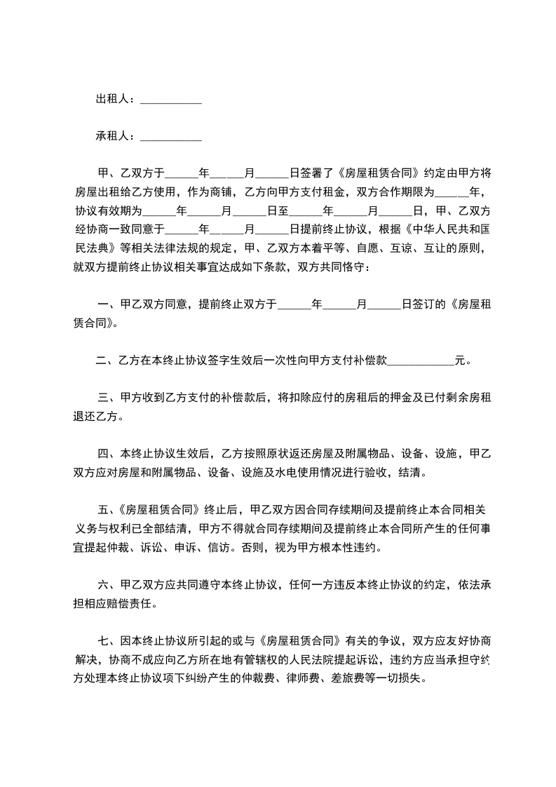 甲方: (出租方)___________ 乙方: (承租方)___________ 甲乙双方按照互利、互惠、平等、自愿、协商一致的原则,根据《民法典》的有关规定,签订以下店面出租协议书样本: 一、被租房屋为_____________________________门面房_____间。 二、租赁期限。租赁期为______年,从______年_____月_____日至______年_____月_____日。合同期满后,甲方如果继续对外租赁本房屋,乙方享有优先承租权,乙方必须在合同到期前10日内,与甲方商议签订新租赁合同,否则按自动弃权处理,甲方有权另行发包。 三、租金每年为________元(大写____________________________),乙方必须于每年的十月一日前一次性将租金交齐,交不齐则视为违约,每超过一天,乙方应按每年房租的10%的罚款赔偿给甲方。 四、租赁期房屋的修缮。房屋属人为的损坏由乙方及时修缮,由于不可抗拒的损坏,由甲方及时修缮。 五、乙方在经营过程中的一切经济纠纷及其它任何责任与甲方无关。 六、店面出租协议书样本的出租方与承租方的变更 1、在合同履行期内,乙方不征得甲方同意,无权将房屋转租给第 三者或相互对换房屋,否则甲方有权收回房屋。 2、在合同期内,如果甲方同意乙方将房屋使用权交付给第三者,本合同对原乙方与房屋使用权者继续有效。 七、在合同履行期间,乙方与第三者发生的一切经济、民事等纠纷,甲方概不负责。 八、在合同履行期间,乙方应保持所租房内外所有设施完好无损,如果确需改造或增设其他固定设施,应征得甲方同意后再进行,所需经费由双方协商,合同期满时,乙方如需拆除,需将房屋恢复原样,不愿拆除或不得拆除的甲方不予补偿。 九、在合同履行期间,如有政策变化,市里统一规划等其它原因需要拆除房屋,其租赁费按实际使用时间计算,本合同即终止。乙方要积极配合不得向甲方提出任何要求。 十、在合同履行期间,要遵纪守法,讲文明道德,自觉维护好室内外卫生。水、电费及社会公共收费(治安、卫生、工商、税务等)由乙方自行缴纳。 十一、甲方责任 1、按合同规定的时间将房屋交给乙方使用,否则每超出一天应赔偿乙方年租金的10% 的经济损失。 2、不按合同内的条款规定修缮房屋的应赔偿乙方由此而造成的经济损失。 3、不得无故终止合同(第九条除外),否则应赔偿乙方年租金的10%的经济损失。 十二、乙方责任 1、不得利用租赁的房屋进行非法活动,损害公共利益。 2、不得干扰和影响周围居民的正常生活。 3、不按合同内的条款规定修缮房屋的其它设施,根据造成的后果,赔偿其经济损失。 4、合同终止后要及时搬出,否则按租赁房屋缴纳租金,并处以租金的10%罚款。 十三、免责条件 如因不可抵抗的自然灾害,使双方或任何一方造成经济损失的,任何一方均不得向对方提出索赔要求。 十四、本合同未尽事宜,依据《中华人民共和国民法典》的有关条款,经双方共同协商,作出补充规定,补充规定与本合同具有同等效力。 十五、本合同自签字之日起生效。 十六、本店面出租协议书样本一式两份,甲乙双方各执一份。 (备注:租金由甲方签约人按年收租,并开具收据,如乙方违背,处以租金的50%罚款,甲方有权立即收回出租门面。) 甲方(出租方): ___________乙方(承租方):___________ 手印: ___________手印:___________ ____年____月____日