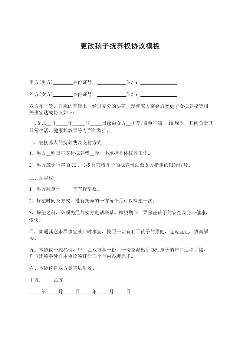 甲方(男方)________身份证号:____________住址:_______________ 乙方(女方)________身份证号:____________住址:_______________ 双方在平等、自愿的基础上,经过充分的协商,现就双方离婚后变更子女抚养权等相关事宜达成协议如下: 一、女儿__自_____年_____月_____日起由女方__抚养,直至年满18周岁,其间负责其日常生活、健康和教育等方面的监护。 二、被抚养人的抚养费及支付方式 1、男方__则每年支付抚养费__元,不承担具体抚养工作。 2、男方应于每年的12月1-5日前将儿子的抚养费汇至女方指定的银行帐号。 三、探视权 1、男方对孩子_____享有探望权。 2、探望时间及方式,没有抚养的一方每个月可以探望一次。 3、探望之前,必须先经与女方电话联系。探望期间,要保证孩子的安全及身心健康、愉快。 四、如遇其它未尽事宜或应时事宜,按照一切有利于孩子的原则,互谅互让,协商解决。 五、本协议一式叁份,甲、乙双方各一份,一份交派出所办理孩子的户口迁移手续,户口迁移手续自本协议签订后三个月内办理完毕。 六、本协议自双方签字后生效。 甲方:____乙方:____ _____年_____月_____日_____年_____月_____日
