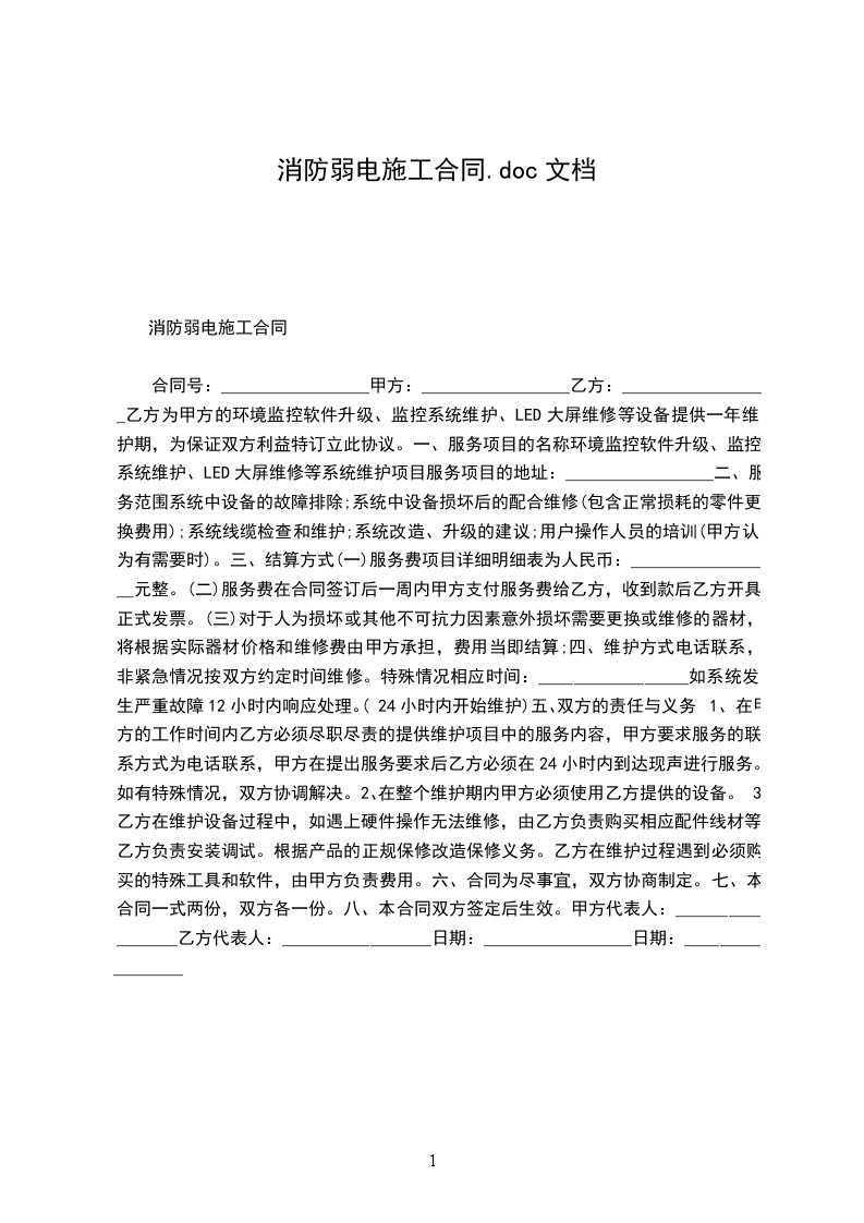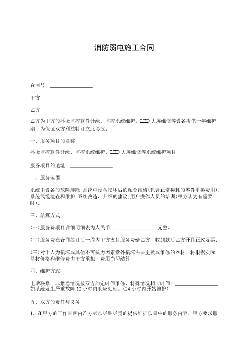合同号:_________________ 甲方:_________________ 乙方:_________________ 乙方为甲方的环境监控软件升级、监控系统维护、LED大屏维修等设备提供一年维护期,为保证双方利益特订立此协议。 一、服务项目的名称 环境监控软件升级、监控系统维护、LED大屏维修等系统维护项目 服务项目的地址:_________________ 二、服务范围 系统中设备的故障排除;系统中设备损坏后的配合维修(包含正常损耗的零件更换费用);系统线缆检查和维护;系统改造、升级的建议;用户操作人员的培训(甲方认为有需要时)。 三、结算方式 (一)服务费项目详细明细表为人民币:_________________元整。 (二)服务费在合同签订后一周内甲方支付服务费给乙方,收到款后乙方开具正式发票。 (三)对于人为损坏或其他不可抗力因素意外损坏需要更换或维修的器材,将根据实际器材价格和维修费由甲方承担,费用当即结算; 四、维护方式 电话联系,非紧急情况按双方约定时间维修。特殊情况相应时间:_________________如系统发生严重故障12小时内响应处理。(24小时内开始维护) 五、双方的责任与义务 1、在甲方的工作时间内乙方必须尽职尽责的提供维护项目中的服务内容,甲方要求服务的联系方式为电话联系,甲方在提出服务要求后乙方必须在24小时内到达现声进行服务。如有特殊情况,双方协调解决。 2、在整个维护期内甲方必须使用乙方提供的设备。 3、乙方在维护设备过程中,如遇上硬件操作无法维修,由乙方负责购买相应配件线材等,乙方负责免费安装调试。根据产品的正规保修改造保修义务。乙方在维护过程遇到必须购买的特殊工具和软件,由甲方负责费用。 六、合同为尽事宜,双方协商制定。 七、本合同一式两份,双方各一份。 八、本合同双方签定后生效。 甲方代表人:_________________乙方代表人:_________________ 日期:_________________日期:_________________