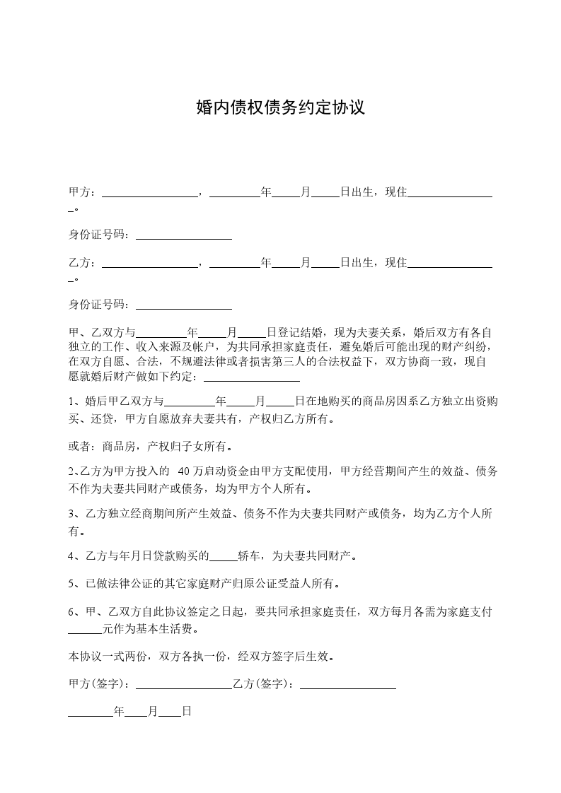 甲方:_________________,_________年_____月_____日出生,现住________________。 身份证号码:_________________ 乙方:_________________,_________年_____月_____日出生,现住________________。 身份证号码:_________________ 甲、乙双方与_________年_____月_____日登记结婚,现为夫妻关系,婚后双方有各自独立的工作、收入来源及账户,为共同承担家庭责任,避免婚后可能出现的财产纠纷,在双方自愿、合法,不规避法律或者损害第三人的合法权益下,双方协商一致,现自愿就婚后财产做如下约定:_________________ 1、婚后甲乙双方与_________年_____月_____日在地购买的商品房因系乙方独立出资购买、还贷,甲方自愿放弃夫妻共有,产权归乙方所有。 或者:商品房,产权归子女所有。 2、乙方为甲方投入的40万启动资金由甲方支配使用,甲方经营期间产生的效益、债务不作为夫妻共同财产或债务,均为甲方个人所有。 3、乙方独立经商期间所产生效益、债务不作为夫妻共同财产或债务,均为乙方个人所有。 4、乙方与_____年_____月_____日贷款购买的_____轿车,为夫妻共同财产。 5、已做法律公证的其它家庭财产归原公证受益人所有。 6、甲、乙双方自此协议签定之日起,要共同承担家庭责任,双方每月各需为家庭支付______元作为基本生活费。 本协议一式两份,双方各执一份,经双方签字后生效。 甲方(签字):_________________乙方(签字):_________________ ________年____月____日