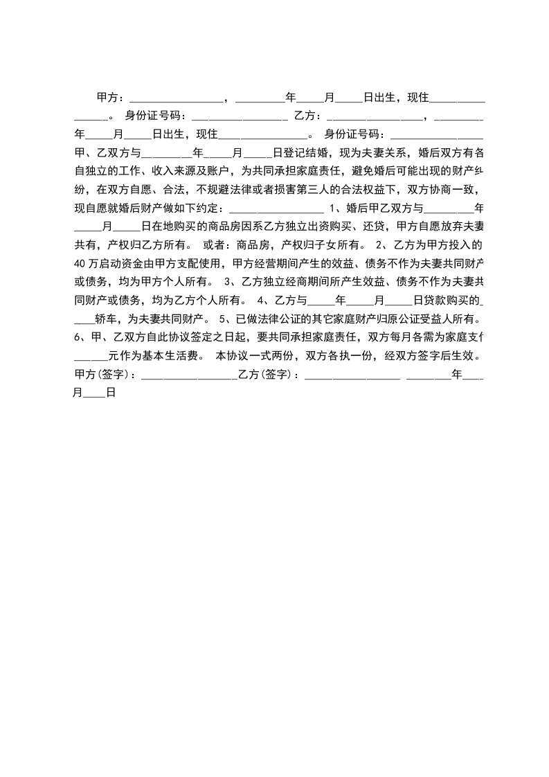 甲方:_________________,_________年_____月_____日出生,现住________________。 身份证号码:_________________ 乙方:_________________,_________年_____月_____日出生,现住________________。 身份证号码:_________________ 甲、乙双方与_________年_____月_____日登记结婚,现为夫妻关系,婚后双方有各自独立的工作、收入来源及账户,为共同承担家庭责任,避免婚后可能出现的财产纠纷,在双方自愿、合法,不规避法律或者损害第三人的合法权益下,双方协商一致,现自愿就婚后财产做如下约定:_________________ 1、婚后甲乙双方与_________年_____月_____日在地购买的商品房因系乙方独立出资购买、还贷,甲方自愿放弃夫妻共有,产权归乙方所有。 或者:商品房,产权归子女所有。 2、乙方为甲方投入的40万启动资金由甲方支配使用,甲方经营期间产生的效益、债务不作为夫妻共同财产或债务,均为甲方个人所有。 3、乙方独立经商期间所产生效益、债务不作为夫妻共同财产或债务,均为乙方个人所有。 4、乙方与_____年_____月_____日贷款购买的_____轿车,为夫妻共同财产。 5、已做法律公证的其它家庭财产归原公证受益人所有。 6、甲、乙双方自此协议签定之日起,要共同承担家庭责任,双方每月各需为家庭支付______元作为基本生活费。 本协议一式两份,双方各执一份,经双方签字后生效。 甲方(签字):_________________乙方(签字):_________________ ________年____月____日
