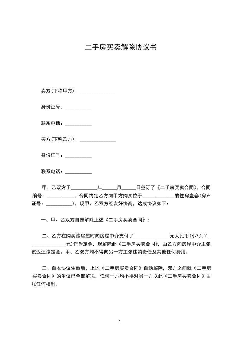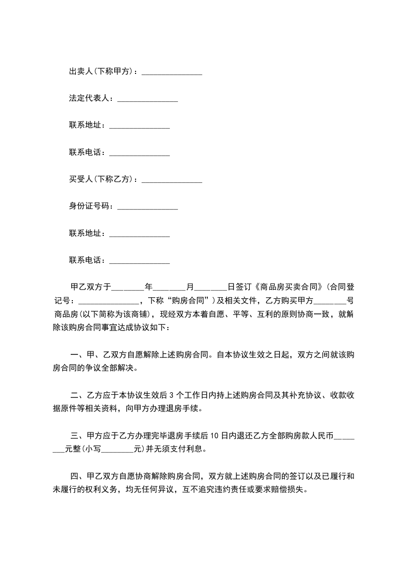 甲方:_________________ 乙方:_________________ 甲乙双方通过友好协商,就乙方申请退还已购买甲方房屋的退房,解除原房屋买卖合同的相关事宜达成如下协议:_________________ 一、乙方将__________年__________月__________日购买的_______________房屋退还给甲方。 二、乙方和其爱人有义务配合甲方同房地产管理局、及其他部门办理房屋退房的相关手续。 三、因办理退房手续而发生的相关费用和损失由乙方负责。 四、在乙方办理好退房手续后五个工作日内甲方将乙方的首付款__________万元退还给乙方,将购房贷款__________万元退还给__________银行,归还银行利息的部分由乙方负责偿还。 五、违约金:_________________违约方需支付违约金_____万元。 六、本合同正本两份,双方各执一份,具有法律约束力。 七、本合同双方签字后生效,之前双方签订的房屋买卖合同自本合同的生效而自行失效。 八、本合同解释权归甲方所有。 甲方盖章:_________________乙方签字:_________________ 负责人签字:_________________乙方身份证号码:_________________ _____年_____月_____日
