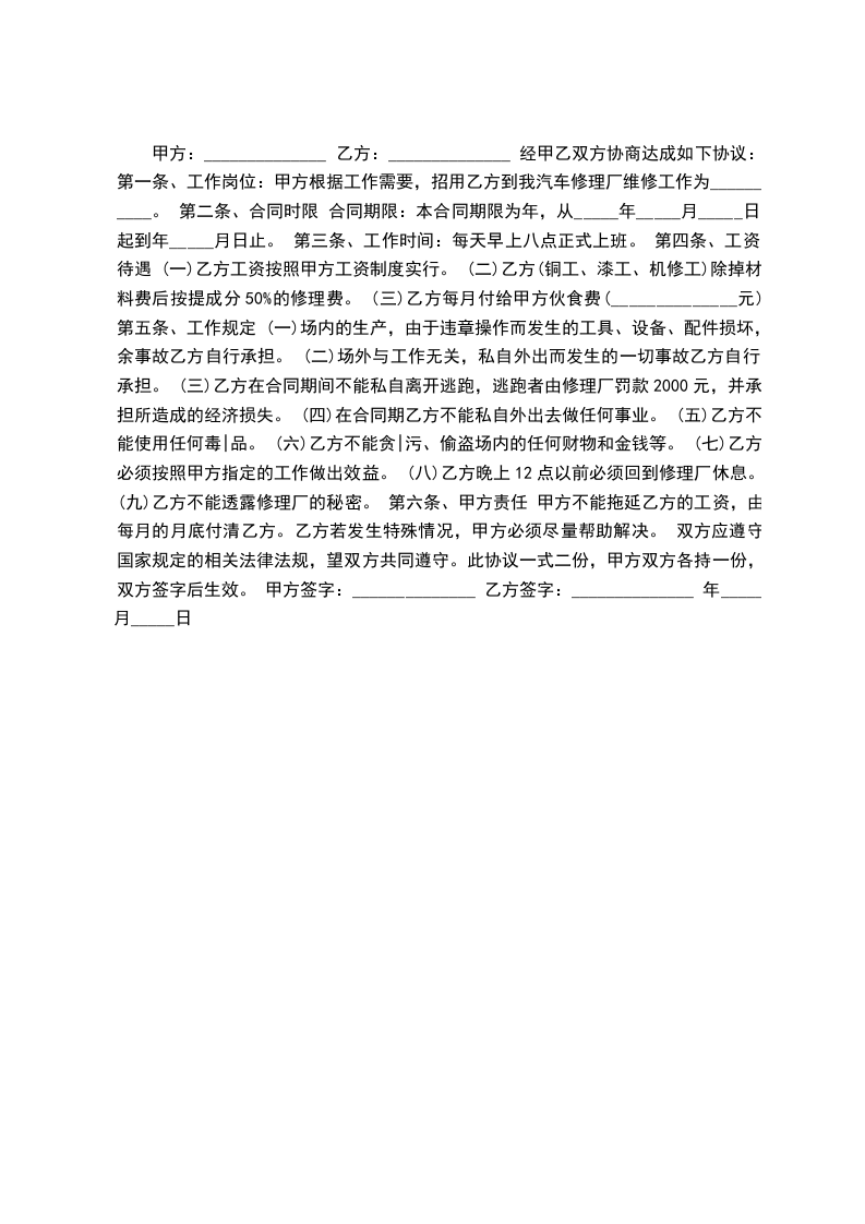 甲方:______________ 乙方:______________ 经甲乙双方协商达成如下协议: 第一条、工作岗位:甲方根据工作需要,招用乙方到我汽车修理厂维修工作为__________。 第二条、合同时限 合同期限:本合同期限为年,从_____年_____月_____日起到年_____月日止。 第三条、工作时间:每天早上八点正式上班。 第四条、工资待遇 (一)乙方工资按照甲方工资制度实行。 (二)乙方(铜工、漆工、机修工)除掉材料费后按提成分50%的修理费。 (三)乙方每月付给甲方伙食费(______________元) 第五条、工作规定 (一)场内的生产,由于违章操作而发生的工具、设备、配件损坏,余事故乙方自行承担。 (二)场外与工作无关,私自外出而发生的一切事故乙方自行承担。 (三)乙方在合同期间不能私自离开逃跑,逃跑者由修理厂罚款2000元,并承担所造成的经济损失。 (四)在合同期乙方不能私自外出去做任何事业。 (五)乙方不能使用任何毒|品。 (六)乙方不能贪|污、偷盗场内的任何财物和金钱等。 (七)乙方必须按照甲方指定的工作做出效益。 (八)乙方晚上12点以前必须回到修理厂休息。 (九)乙方不能透露修理厂的秘密。 第六条、甲方责任 甲方不能拖延乙方的工资,由每月的月底付清乙方。乙方若发生特殊情况,甲方必须尽量帮助解决。 双方应遵守国家规定的相关法律法规,望双方共同遵守。此协议一式二份,甲方双方各持一份,双方签字后生效。 甲方签字:______________ 乙方签字:______________ 年_____月_____日