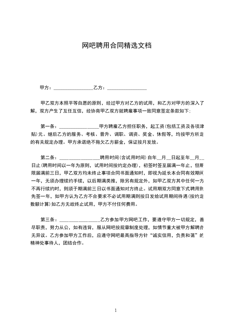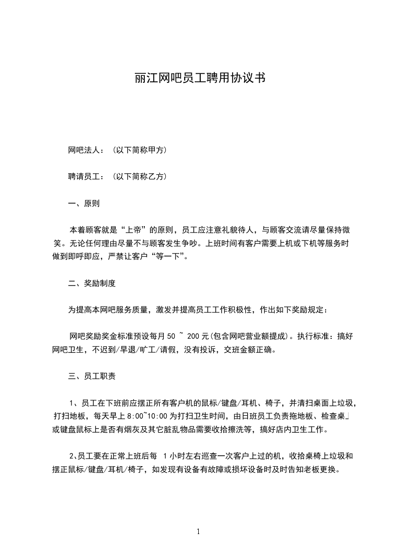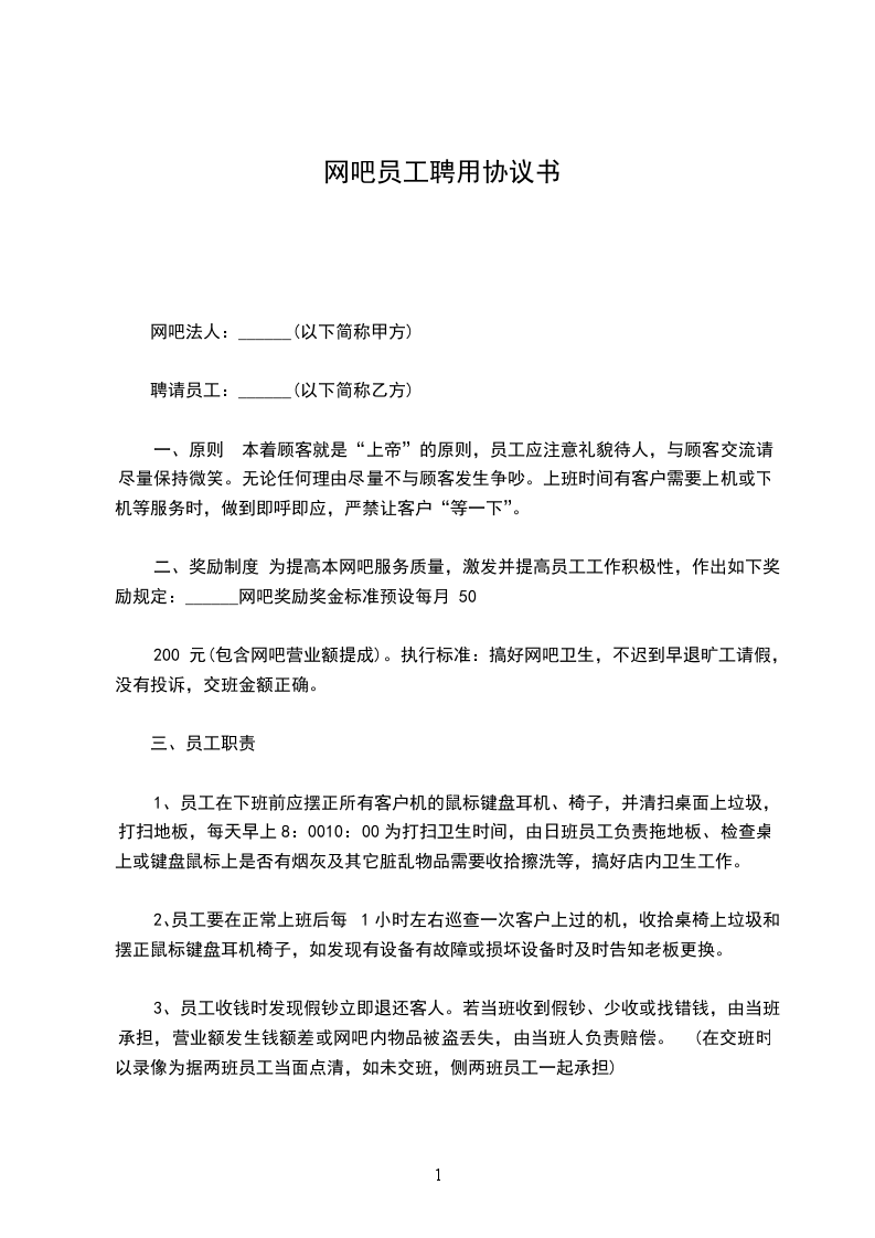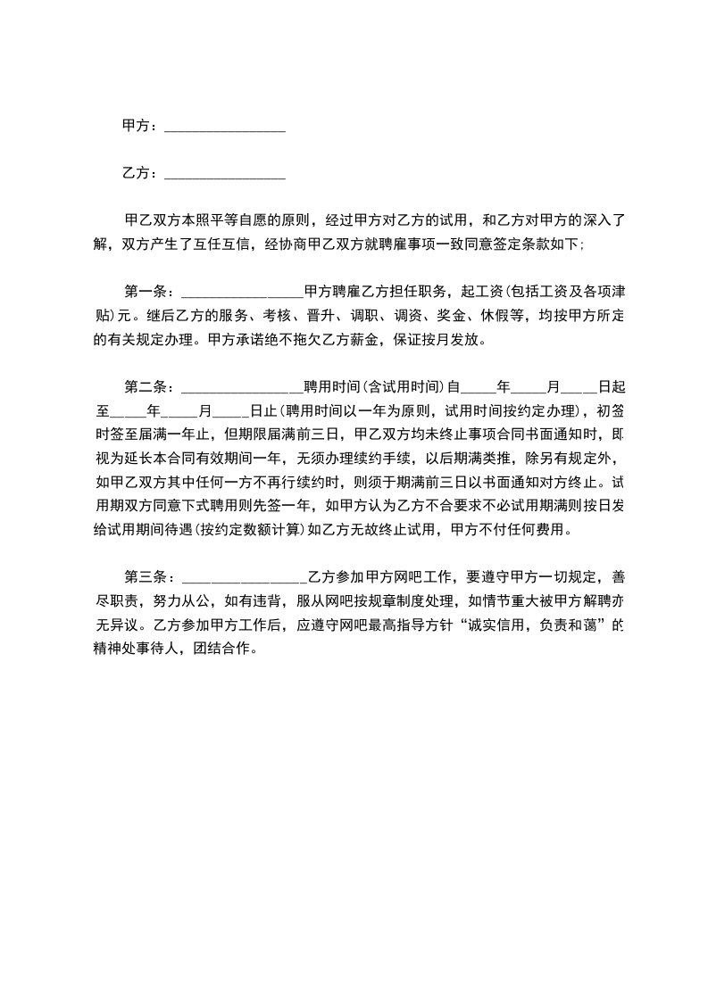 第三条:_________________乙方参加甲方网吧工作,要遵守甲方一切规定,善尽职责,努力从公,如有违背,服从网吧按规章制度处理,如情节重大被甲方解聘亦无异议。乙方参加甲方工作后,应遵守网吧最高指导方针“诚实信用,负责和蔼”的精神处事待人,团结合作。