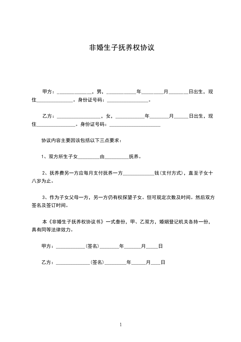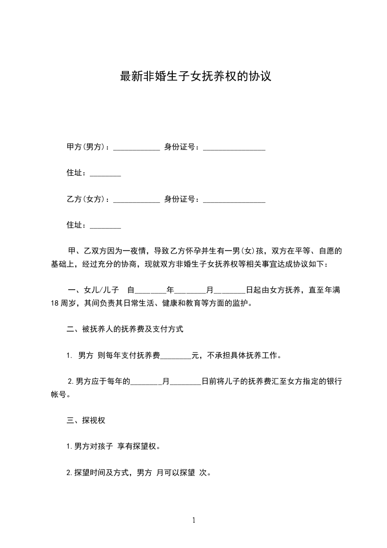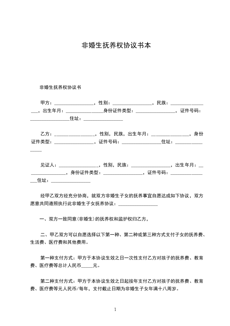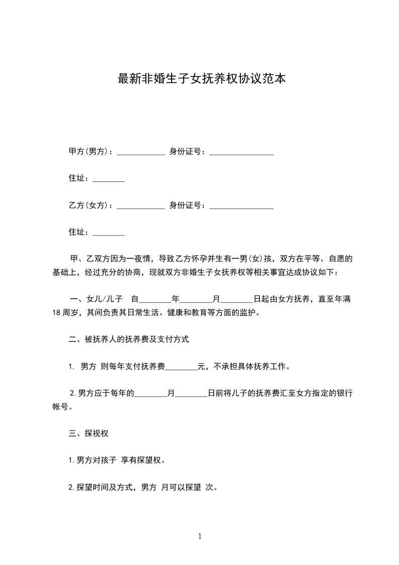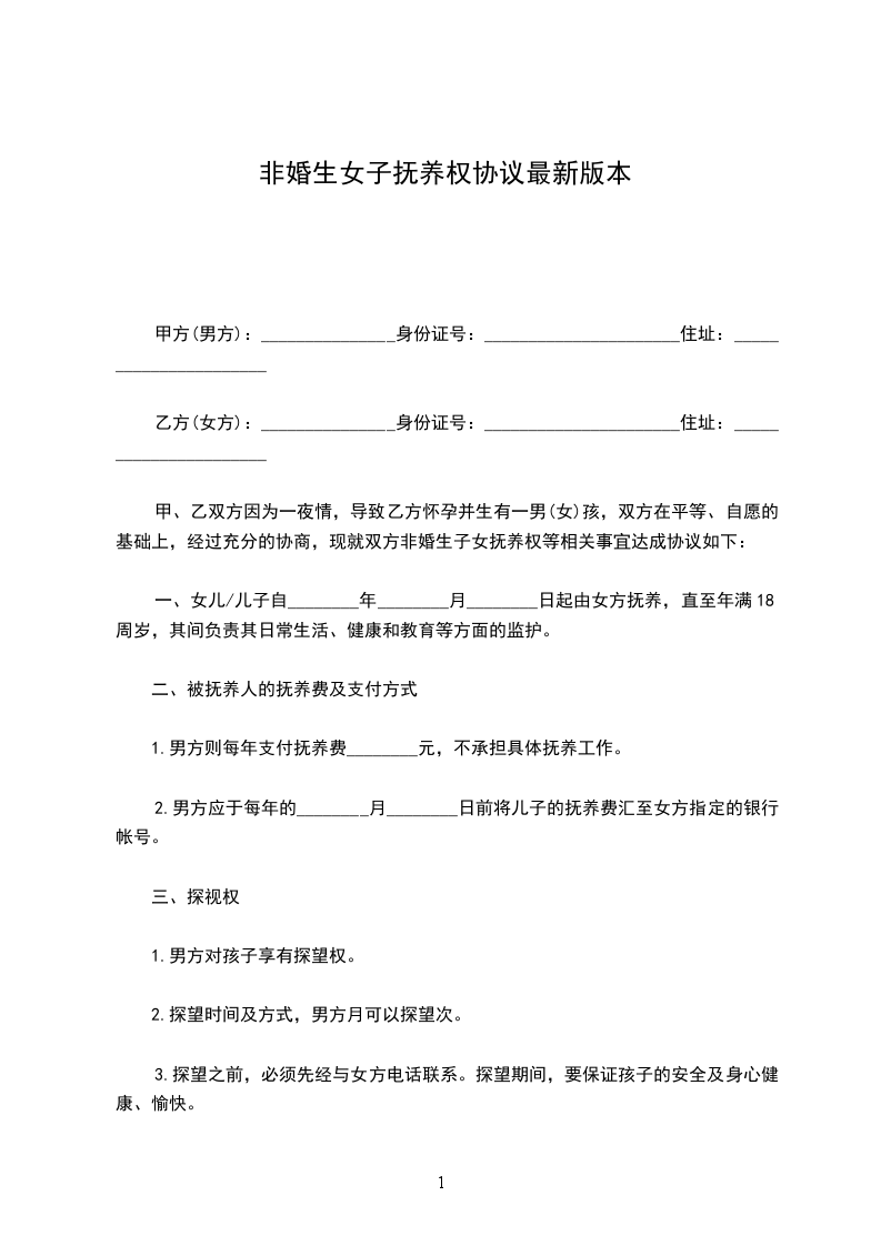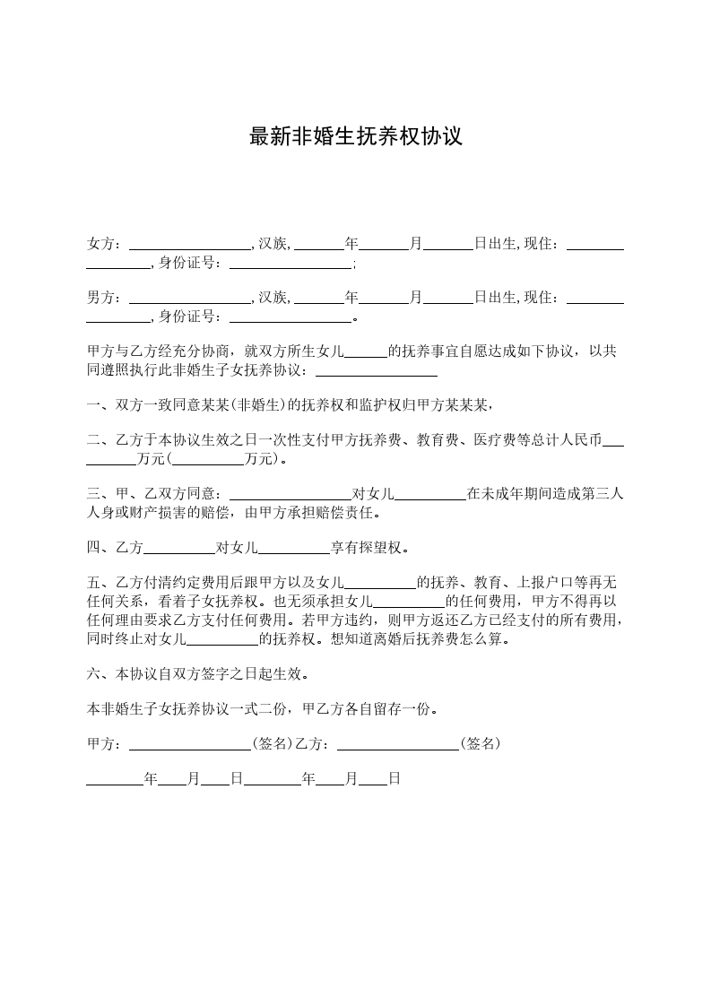 女方:_________________,汉族,_______年_______月_______日出生,现住:_________________,身份证号:_________________; 男方:_________________,汉族,_______年_______月_______日出生,现住:_________________,身份证号:_________________。 甲方与乙方经充分协商,就双方所生女儿______的抚养事宜自愿达成如下协议,以共同遵照执行此非婚生子女抚养协议:_________________ 一、双方一致同意某某(非婚生)的抚养权和监护权归甲方某某某, 二、乙方于本协议生效之日一次性支付甲方抚养费、教育费、医疗费等总计人民币__________万元(__________万元)。 三、甲、乙双方同意:_________________对女儿__________在未成年期间造成第三人人身或财产损害的赔偿,由甲方承担赔偿责任。 四、乙方__________对女儿__________享有探望权。 五、乙方付清约定费用后跟甲方以及女儿__________的抚养、教育、上报户口等再无任何关系,看着子女抚养权。也无须承担女儿__________的任何费用,甲方不得再以任何理由要求乙方支付任何费用。若甲方违约,则甲方返还乙方已经支付的所有费用,同时终止对女儿__________的抚养权。想知道离婚后抚养费怎么算。 六、本协议自双方签字之日起生效。 本非婚生子女抚养协议一式二份,甲乙方各自留存一份。 甲方:_________________(签名)乙方:_________________(签名) ________年____月____日________年____月____日