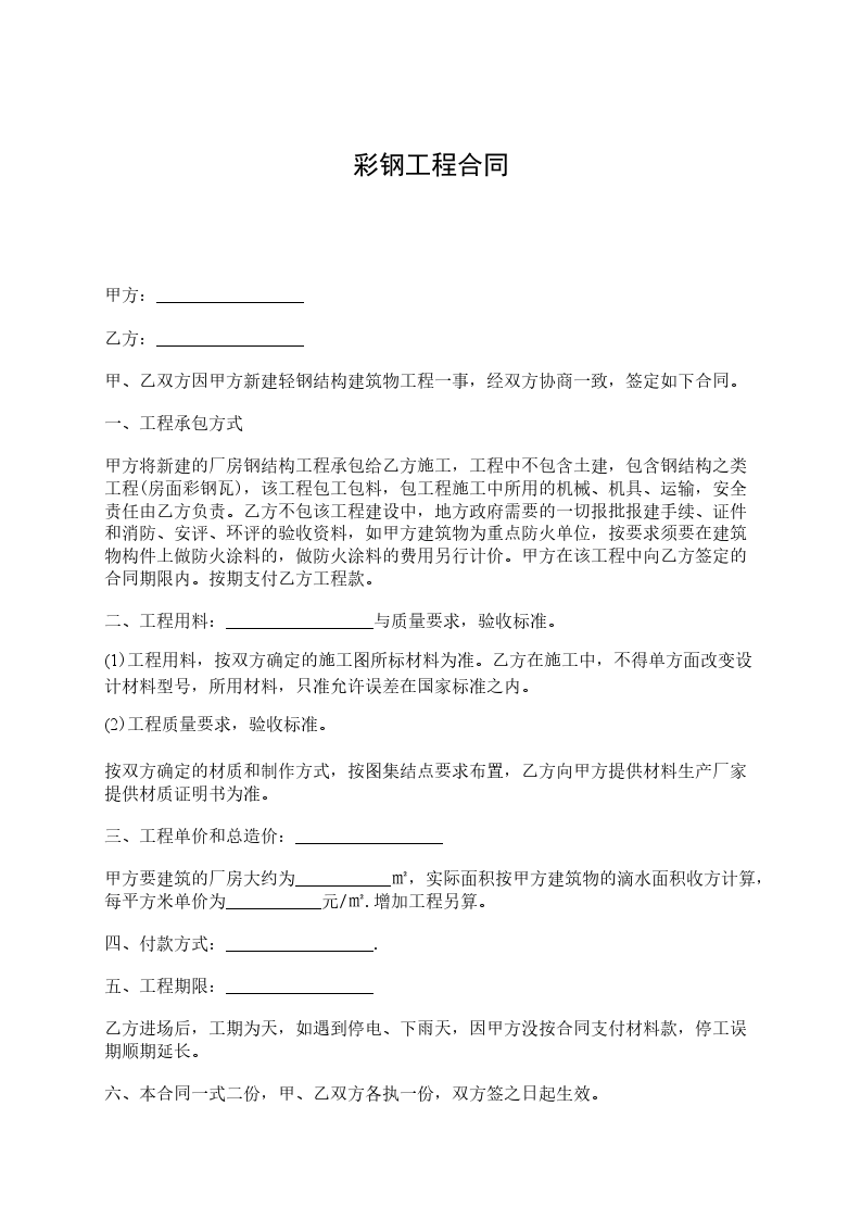 甲方:_________________ 乙方:_________________ 甲、乙双方因甲方新建轻钢结构建筑物工程一事,经双方协商一致,签定如下合同。 一、工程承包方式 甲方将新建的厂房钢结构工程承包给乙方施工,工程中不包含土建,包含钢结构之类工程(房面彩钢瓦),该工程包工包料,包工程施工中所用的机械、机具、运输,安全责任由乙方负责。乙方不包该工程建设中,地方政府需要的一切报批报建手续、证件和消防、安评、环评的验收资料,如甲方建筑物为重点防火单位,按要求须要在建筑物构件上做防火涂料的,做防火涂料的费用另行计价。甲方在该工程中向乙方签定的合同期限内。按期支付乙方工程款。 二、工程用料:_________________与质量要求,验收标准。 (1)工程用料,按双方确定的施工图所标材料为准。乙方在施工中,不得单方面改变设计材料型号,所用材料,只准允许误差在国家标准之内。 (2)工程质量要求,验收标准。 按双方确定的材质和制作方式,按图集结点要求布置,乙方向甲方提供材料生产厂家提供材质证明书为准。 三、工程单价和总造价:_________________ 甲方要建筑的厂房大约为___________㎡,实际面积按甲方建筑物的滴水面积收方计算,每平方米单价为___________元/㎡.增加工程另算。 四、付款方式:_________________. 五、工程期限:_________________ 乙方进场后,工期为天,如遇到停电、下雨天,因甲方没按合同支付材料款,停工误期顺期延长。 六、本合同一式二份,甲、乙双方各执一份,双方签之日起生效。 甲方(签)___________乙方(签)___________ _____年_____月_____日_____年_____月_____日