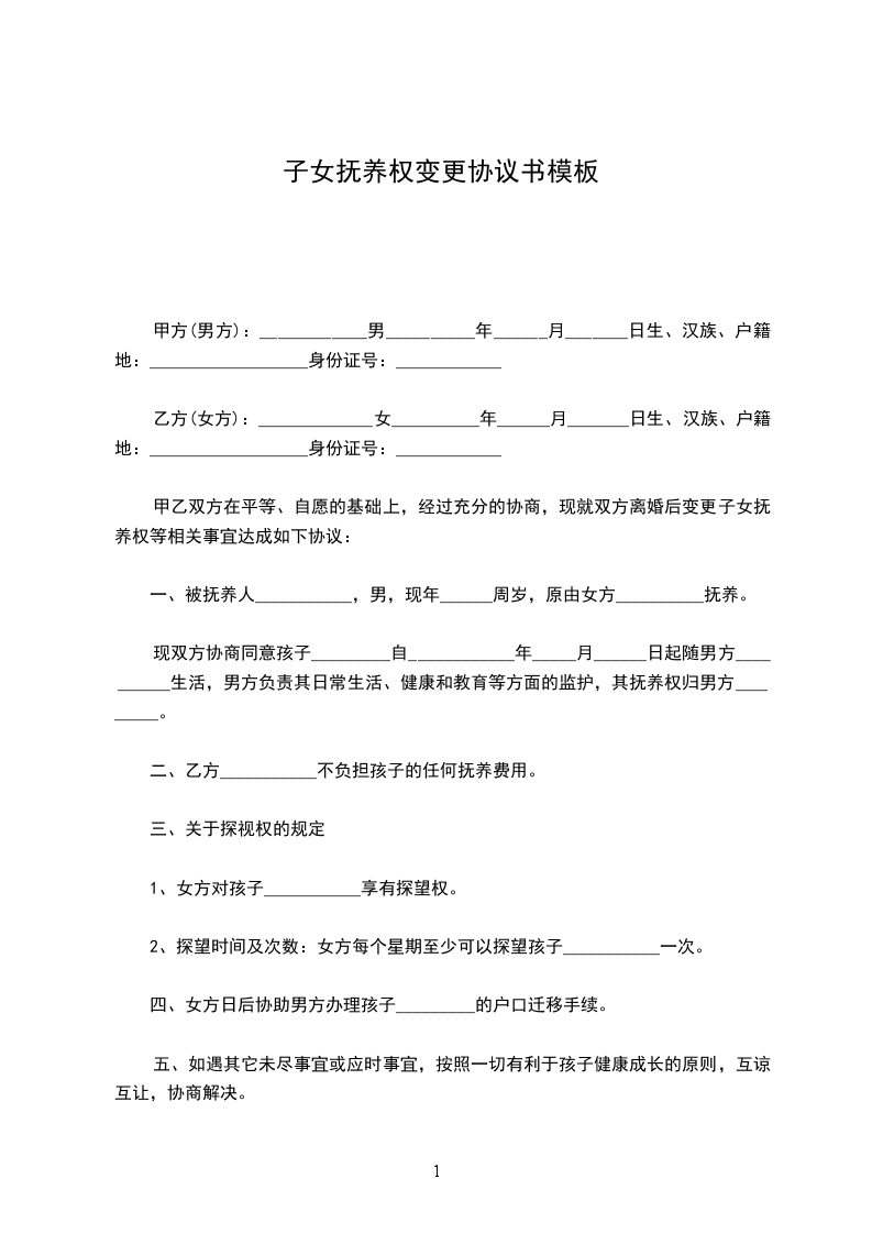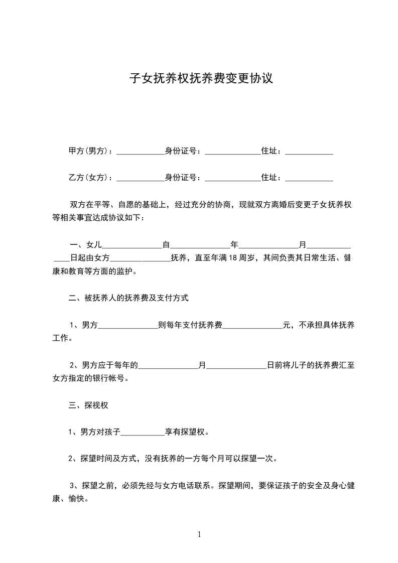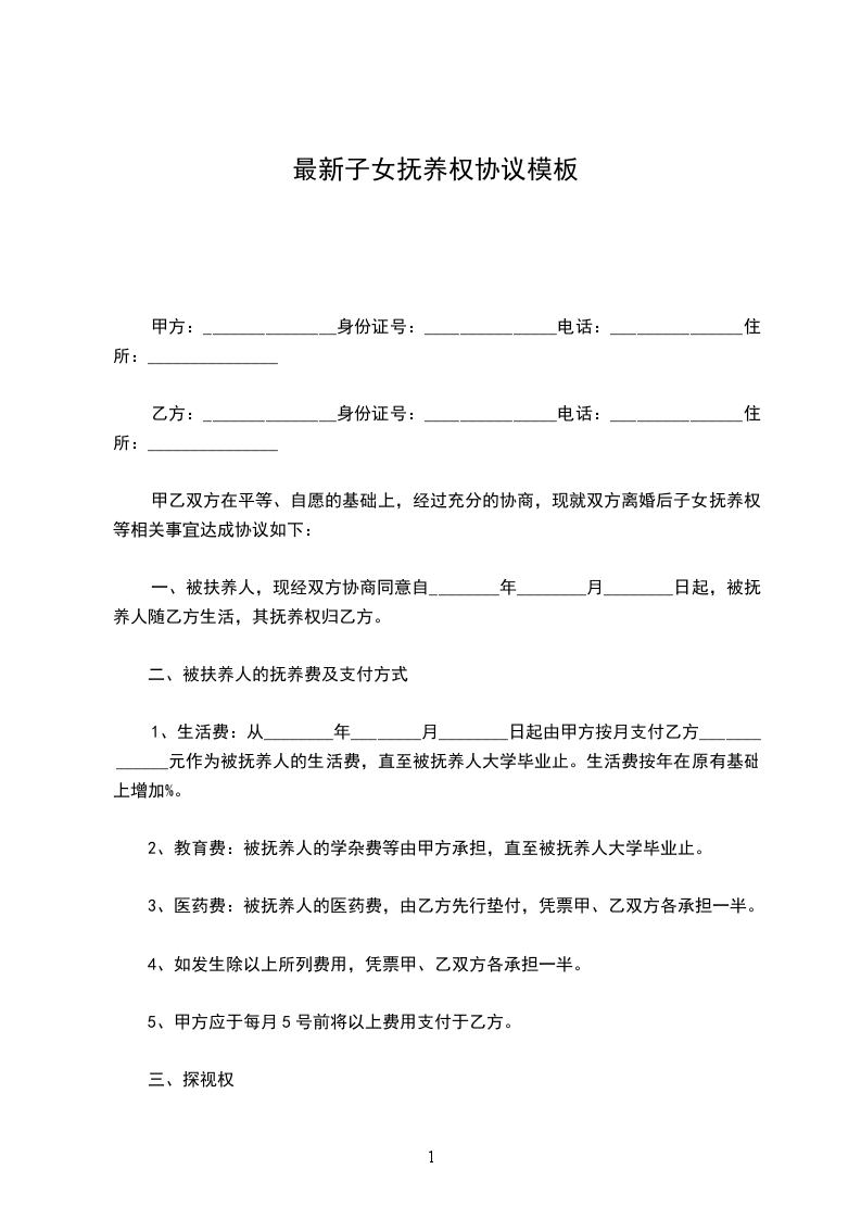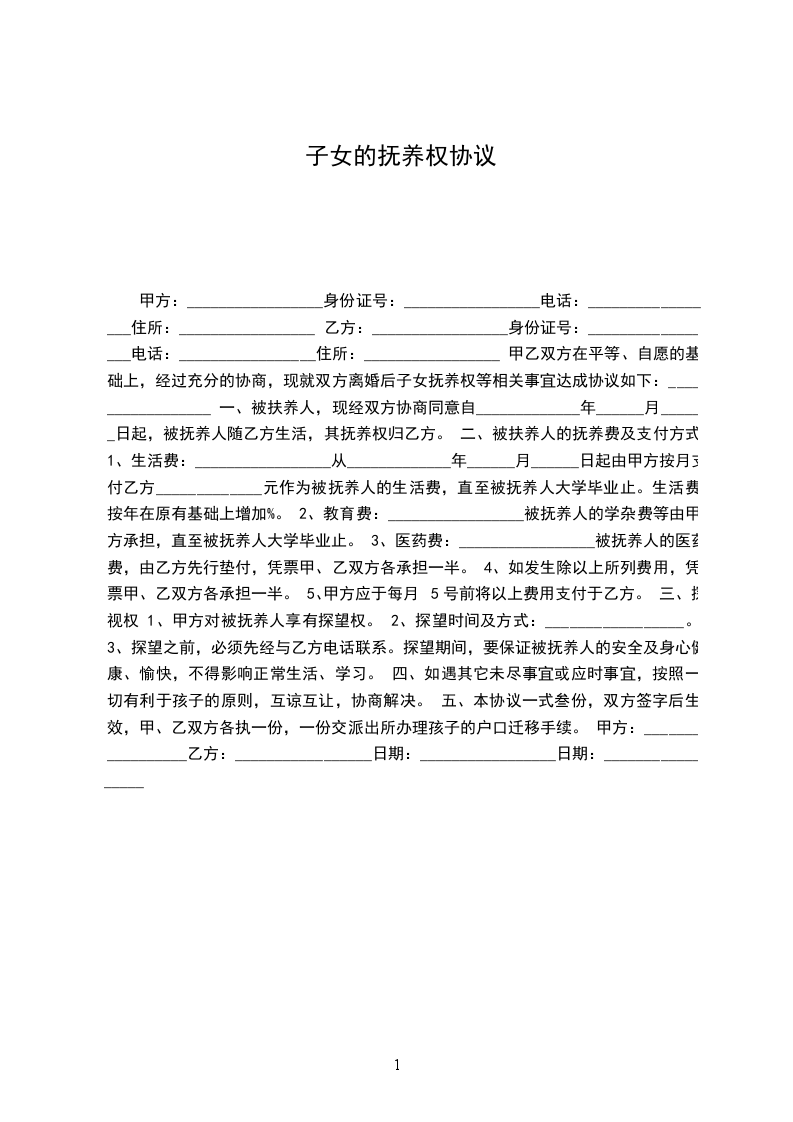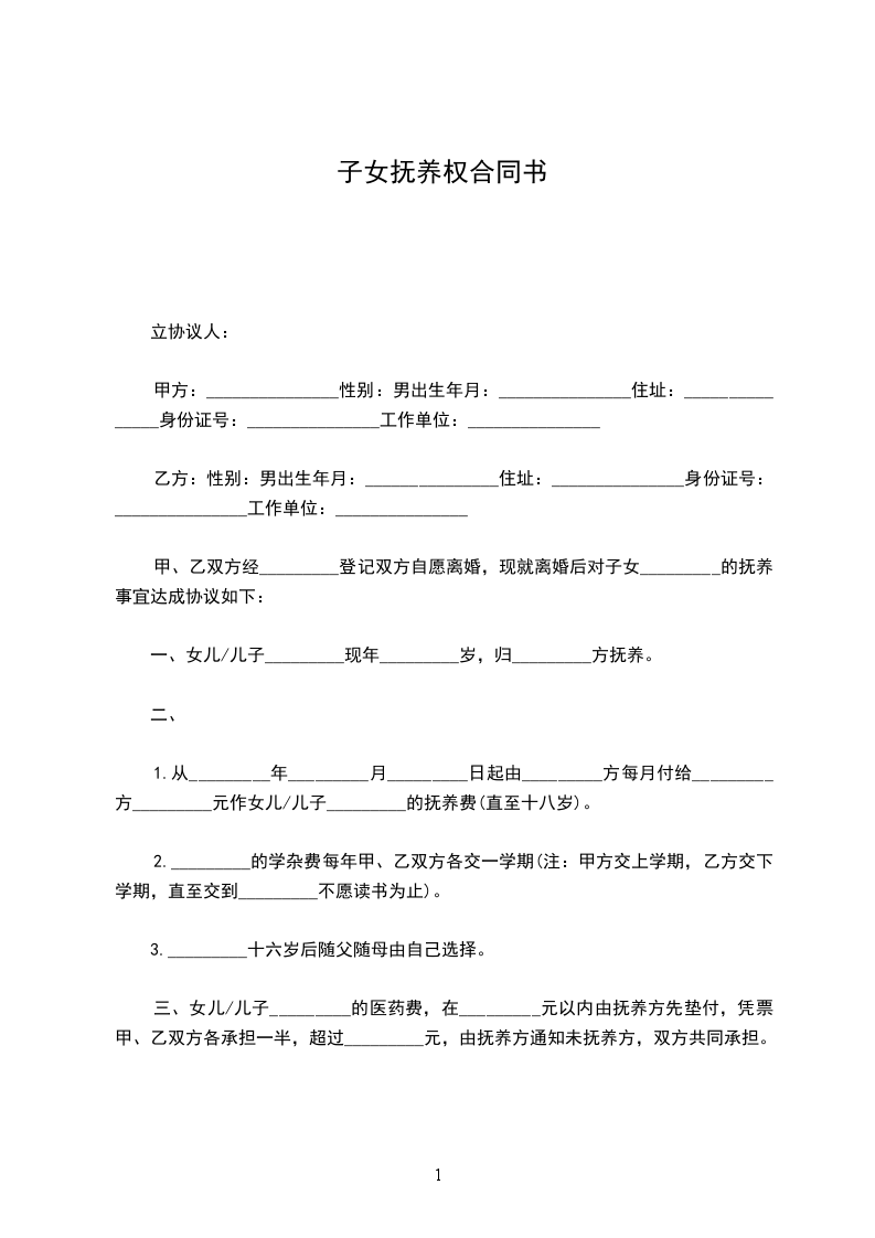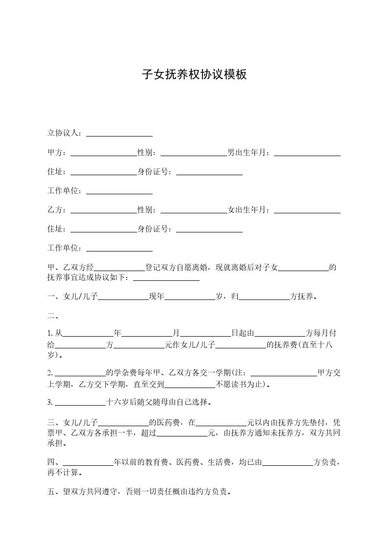 立协议人:_________________ 甲方:_________________性别:_________________男出生年月:_________________ 住址:_________________身份证号:_________________ 工作单位:_________________ 乙方:_________________性别:_________________女出生年月:_________________ 住址:_________________身份证号:_________________ 工作单位:_________________ 甲、乙双方经_____________登记双方自愿离婚,现就离婚后对子女_____________的抚养事宜达成协议如下:_________________ 一、女儿/儿子_____________现年_____________岁,归_____________方抚养。 二、 1.从_____________年_____________月_____________日起由_____________方每月付给_____________方_____________元作女儿/儿子_____________的抚养费(直至十八岁)。 2._____________的学杂费每年甲、乙双方各交一学期(注:_________________甲方交上学期,乙方交下学期,直至交到_____________不愿读书为止)。 3._____________十六岁后随父随母由自己选择。 三、女儿/儿子_____________的医药费,在_____________元以内由抚养方先垫付,凭票甲、乙双方各承担一半,超过_____________元,由抚养方通知未抚养方,双方共同承担。 四、_____________年以前的教育费、医药费、生活费,均已由_____________方负责,再不计算。 五、望双方共同遵守,否则一切责任概由违约方负责。 子女抚养协议书此协议一式贰份,甲、乙双方各一份,此协议签字生效。 甲方(签字):_________________乙方:_________________(签字):_________________ _____________年__________月__________日_____________年__________月__________日