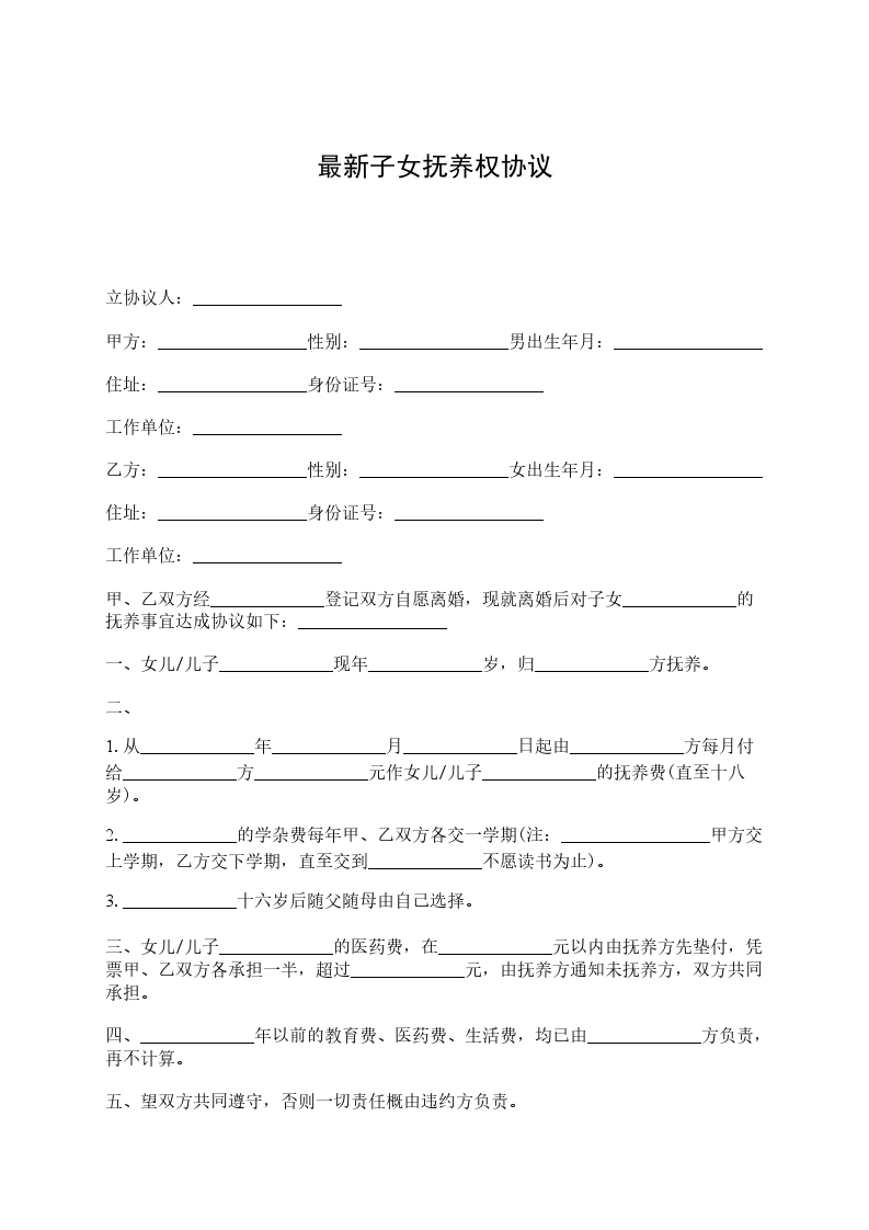 立协议人:_________________ 甲方:_________________性别:_________________男出生年月:_________________ 住址:_________________身份证号:_________________ 工作单位:_________________ 乙方:_________________性别:_________________女出生年月:_________________ 住址:_________________身份证号:_________________ 工作单位:_________________ 甲、乙双方经_____________登记双方自愿离婚,现就离婚后对子女_____________的抚养事宜达成协议如下:_________________ 一、女儿/儿子_____________现年_____________岁,归_____________方抚养。 二、 1.从_____________年_____________月_____________日起由_____________方每月付给_____________方_____________元作女儿/儿子_____________的抚养费(直至十八岁)。 2._____________的学杂费每年甲、乙双方各交一学期(注:_________________甲方交上学期,乙方交下学期,直至交到_____________不愿读书为止)。 3._____________十六岁后随父随母由自己选择。 三、女儿/儿子_____________的医药费,在_____________元以内由抚养方先垫付,凭票甲、乙双方各承担一半,超过_____________元,由抚养方通知未抚养方,双方共同承担。 四、_____________年以前的教育费、医药费、生活费,均已由_____________方负责,再不计算。 五、望双方共同遵守,否则一切责任概由违约方负责。 子女抚养协议书此协议一式贰份,甲、乙双方各一份,此协议签字生效。 甲方(签字):_________________乙方:_________________(签字):_________________ _____________年__________月__________日_____________年__________月__________日