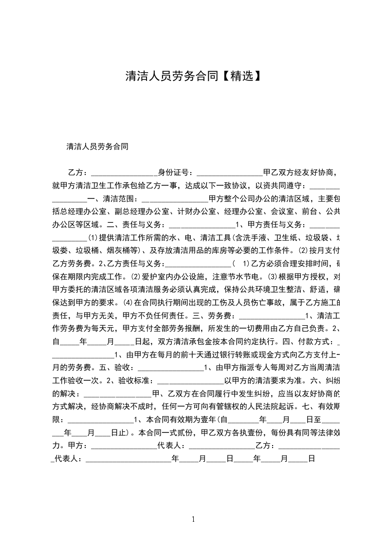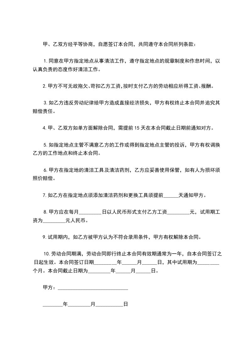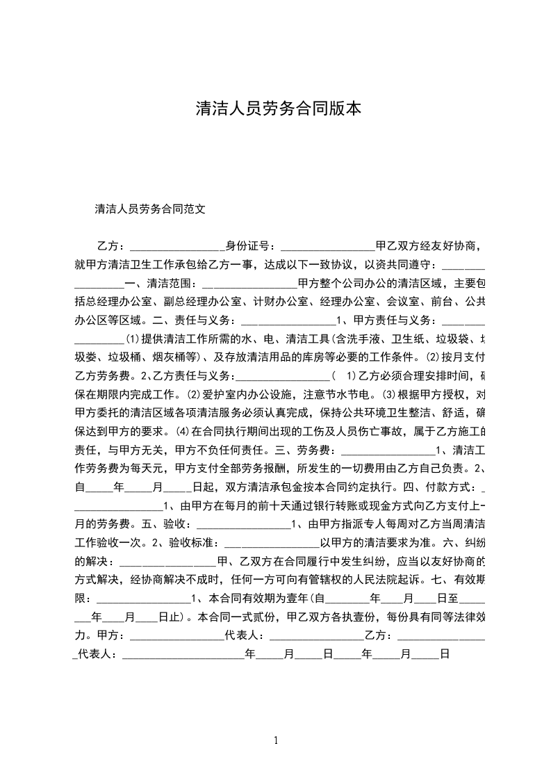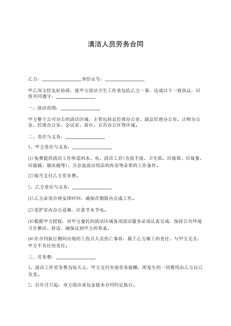 乙方:_________________身份证号:_________________ 甲乙双方经友好协商,就甲方清洁卫生工作承包给乙方一事,达成以下一致协议,以资共同遵守:_________________ 一、清洁范围:_________________ 甲方整个公司办公的清洁区域,主要包括总经理办公室、副总经理办公室、计财办公室、经理办公室、会议室、前台、公共办公区等区域。 二、责任与义务:_________________ 1、甲方责任与义务:_________________ (1)免费提供清洁工作所需的水、电、清洁工具(含洗手液、卫生纸、垃圾袋、垃圾娄、垃圾桶、烟灰桶等)、及存放清洁用品的库房等必要的工作条件。 (2)按月支付乙方劳务费。 2、乙方责任与义务:_________________ (1)乙方必须合理安排时间,确保在期限内完成工作。 (2)爱护室内办公设施,注意节水节电。 (3)根据甲方授权,对甲方委托的清洁区域各项清洁服务必须认真完成,保持公共环境卫生整洁、舒适,确保达到甲方的要求。 (4)在合同执行期间出现的工伤及人员伤亡事故,属于乙方施工的责任,与甲方无关,甲方不负任何责任。 三、劳务费:_________________ 1、清洁工作劳务费为每天元,甲方支付全部劳务报酬,所发生的一切费用由乙方自己负责。 2、自_____年_____月_____日起,双方清洁承包金按本合同约定执行。 四、付款方式:_________________ 1、由甲方在每月的前十天通过银行转帐或现金方式向乙方支付上一月的劳务费。 五、验收:_________________ 1、由甲方指派专人每周对乙方当周清洁工作验收一次。 2、验收标准:_________________以甲方的清洁要求为准。 六、纠纷的解决:_________________ 甲、乙双方在合同履行中发生纠纷,应当以友好协商的方式解决,经协商解决不成时,任何一方可向有管辖权的人民法院起诉。 七、有效期限:_________________ 1、本合同有效期为壹年(自________年____月____日至________年____月____日止)。本合同一式贰份,甲乙双方各执壹份,每份具有同等法律效力。 甲方:_________________代表人:_________________ 乙方:_________________代表人:_________________ _____年_____月_____日_____年_____月_____日
