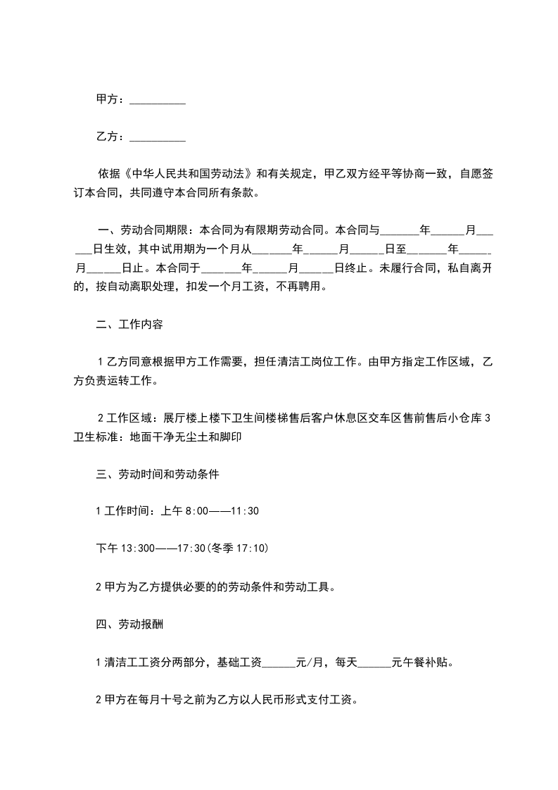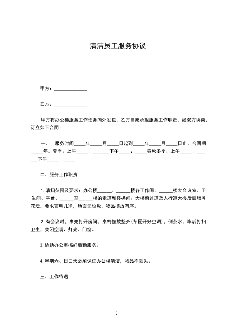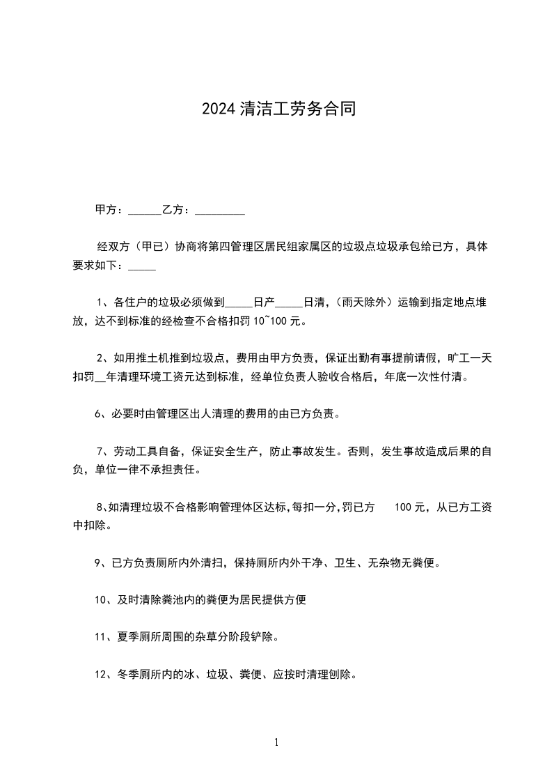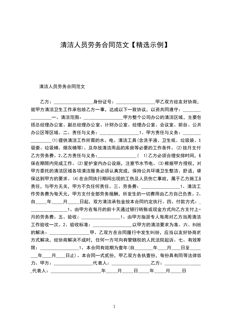 乙方:_________________身份证号:_________________ 甲乙双方经友好协商,就甲方清洁卫生工作承包给乙方一事,达成以下一致协议,以资共同遵守:_________________ 一、清洁范围:_________________ 甲方整个公司办公的清洁区域,主要包括总经理办公室、副总经理办公室、计财办公室、经理办公室、会议室、前台、公共办公区等区域。 二、责任与义务:_________________ 1、甲方责任与义务:_________________ (1)免费提供清洁工作所需的水、电、清洁工具(含洗手液、卫生纸、垃圾袋、垃圾娄、垃圾桶、烟灰桶等)、及存放清洁用品的库房等必要的工作条件。 (2)按月支付乙方劳务费。 2、乙方责任与义务:_________________ (1)乙方必须合理安排时间,确保在期限内完成工作。 (2)爱护室内办公设施,注意节水节电。 (3)根据甲方授权,对甲方委托的清洁区域各项清洁服务必须认真完成,保持公共环境卫生整洁、舒适,确保达到甲方的要求。 (4)在合同执行期间出现的工伤及人员伤亡事故,属于乙方施工的责任,与甲方无关,甲方不负任何责任。 三、劳务费:_________________ 1、清洁工作劳务费为每天元,甲方支付全部劳务报酬,所发生的一切费用由乙方自己负责。 2、自_____年_____月_____日起,双方清洁承包金按本合同约定执行。 四、付款方式:_________________ 1、由甲方在每月的前十天通过银行转帐或现金方式向乙方支付上一月的劳务费。 五、验收:_________________ 1、由甲方指派专人每周对乙方当周清洁工作验收一次。 2、验收标准:_________________以甲方的清洁要求为准。 六、纠纷的解决:_________________ 甲、乙双方在合同履行中发生纠纷,应当以友好协商的方式解决,经协商解决不成时,任何一方可向有管辖权的人民法院起诉。 七、有效期限:_________________ 1、本合同有效期为壹年(自________年____月____日至________年____月____日止)。本合同一式贰份,甲乙双方各执壹份,每份具有同等法律效力。 甲方:_________________代表人:_________________ 乙方:_________________代表人:_________________ _____年_____月_____日_____年_____月_____日