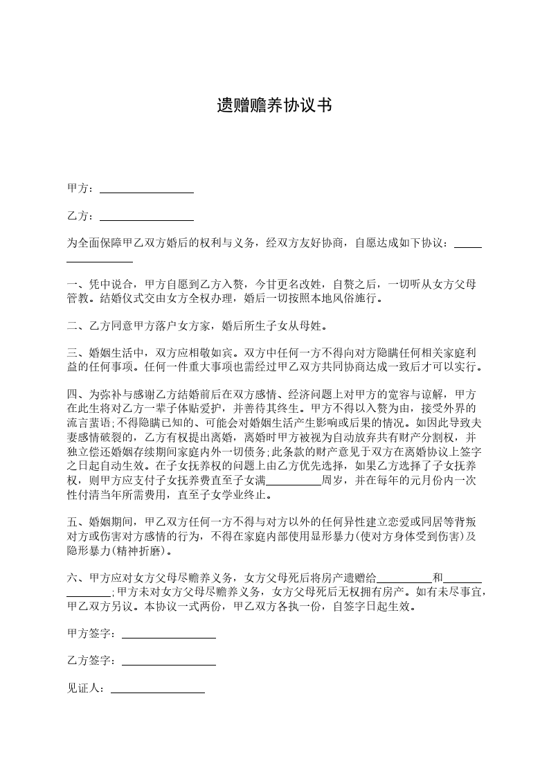 甲方:_________________ 乙方:_________________ 为全面保障甲乙双方婚后的权利与义务,经双方友好协商,自愿达成如下协议:_________________ 一、凭中说合,甲方自愿到乙方入赘,今甘更名改姓,自赘之后,一切听从女方父母管教。结婚仪式交由女方全权办理,婚后一切按照本地风俗施行。 二、乙方同意甲方落户女方家,婚后所生子女从母姓。 三、婚姻生活中,双方应相敬如宾。双方中任何一方不得向对方隐瞒任何相关家庭利益的任何事项。任何一件重大事项也需经过甲乙双方共同协商达成一致后才可以实行。 四、为弥补与感谢乙方结婚前后在双方感情、经济问题上对甲方的宽容与谅解,甲方在此生将对乙方一辈子体贴爱护,并善待其终生。甲方不得以入赘为由,接受外界的流言蜚语;不得隐瞒已知的、可能会对婚姻生活产生影响或后果的情况。如因此导致夫妻感情破裂的,乙方有权提出离婚,离婚时甲方被视为自动放弃共有财产分割权,并独立偿还婚姻存续期间家庭内外一切债务;此条款的财产意见于双方在离婚协议上签字之日起自动生效。在子女抚养权的问题上由乙方优先选择,如果乙方选择了子女抚养权,则甲方应支付子女抚养费直至子女满__________周岁,并在每年的元月份内一次性付清当年所需费用,直至子女学业终止。 五、婚姻期间,甲乙双方任何一方不得与对方以外的任何异性建立恋爱或同居等背叛对方或伤害对方感情的行为,不得在家庭内部使用显形暴力(使对方身体受到伤害)及隐形暴力(精神折磨)。 六、甲方应对女方父母尽赡养义务,女方父母死后将房产遗赠给__________和_______________;甲方未对女方父母尽赡养义务,女方父母死后无权拥有房产。如有未尽事宜,甲乙双方另议。本协议一式两份,甲乙双方各执一份,自签字日起生效。 甲方签字:_________________ 乙方签字:_________________ 见证人:_________________ 凭中人:_________________ 媒人:_________________ 代字人:_________________ _____年_____月_____日