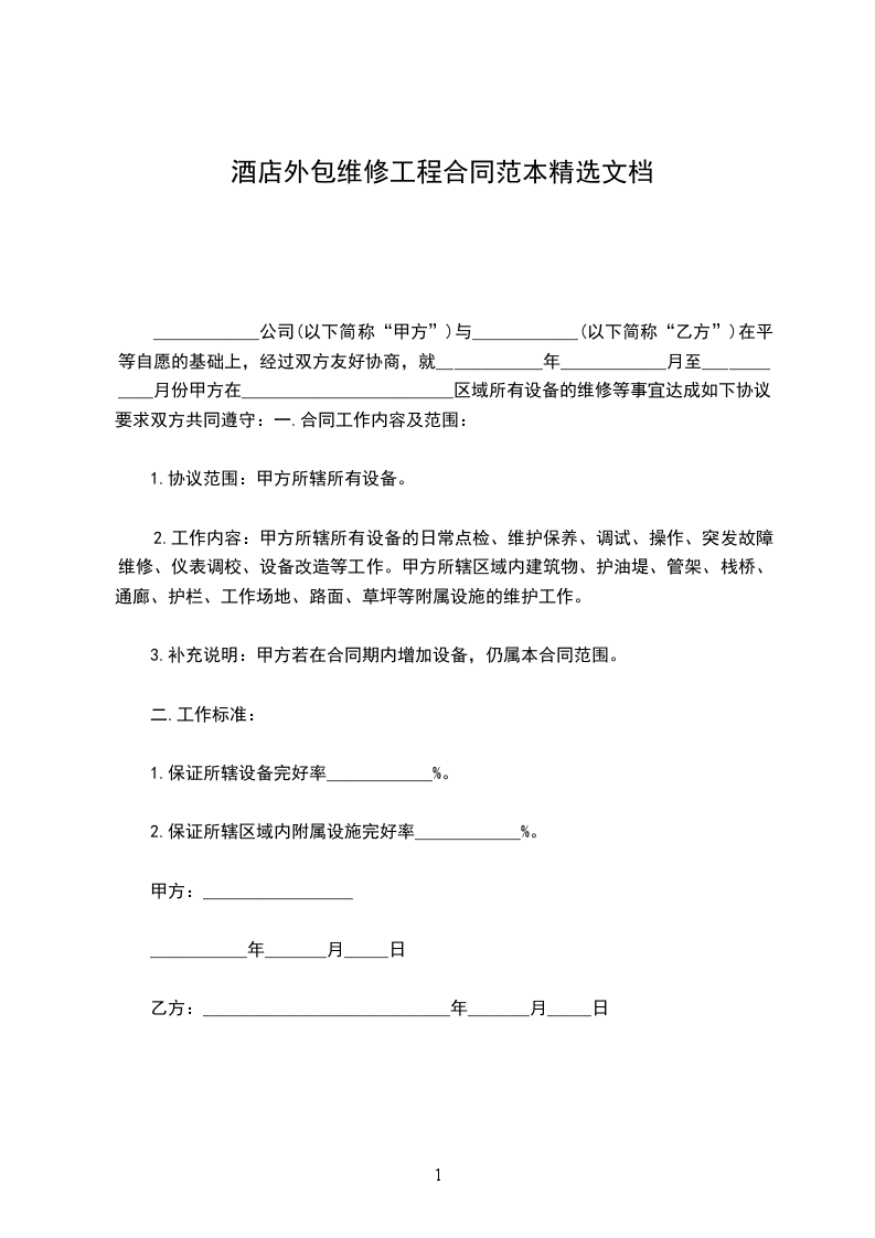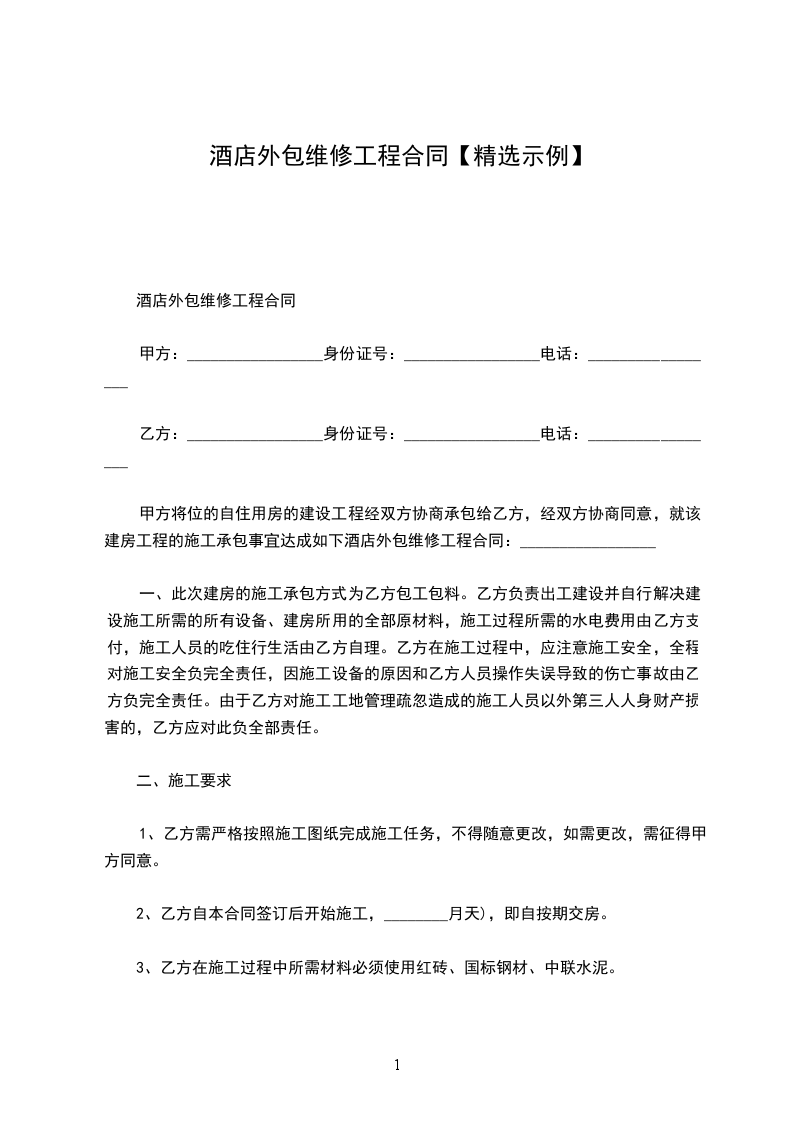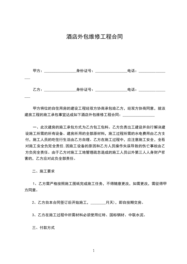 甲方将位的自住用房的建设工程经双方协商承包给乙方,经双方协商同意,就该建房工程的施工承包事宜达成如下酒店外包维修工程合同:_________________