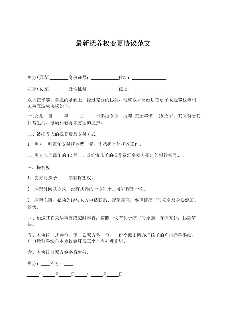 甲方(男方)________身份证号:____________住址:_______________ 乙方(女方)________身份证号:____________住址:_______________ 双方在平等、自愿的基础上,经过充分的协商,现就双方离婚后变更子女抚养权等相关事宜达成协议如下: 一、女儿__自_____年_____月_____日起由女方__抚养,直至年满18周岁,其间负责其日常生活、健康和教育等方面的监护。 二、被抚养人的抚养费及支付方式 1、男方__则每年支付抚养费__元,不承担具体抚养工作。 2、男方应于每年的12月1-5日前将儿子的抚养费汇至女方指定的银行帐号。 三、探视权 1、男方对孩子_____享有探望权。 2、探望时间及方式,没有抚养的一方每个月可以探望一次。 3、探望之前,必须先经与女方电话联系。探望期间,要保证孩子的安全及身心健康、愉快。 四、如遇其它未尽事宜或应时事宜,按照一切有利于孩子的原则,互谅互让,协商解决。 五、本协议一式叁份,甲、乙双方各一份,一份交派出所办理孩子的户口迁移手续,户口迁移手续自本协议签订后三个月内办理完毕。 六、本协议自双方签字后生效。 甲方:____乙方:____ _____年_____月_____日_____年_____月_____日