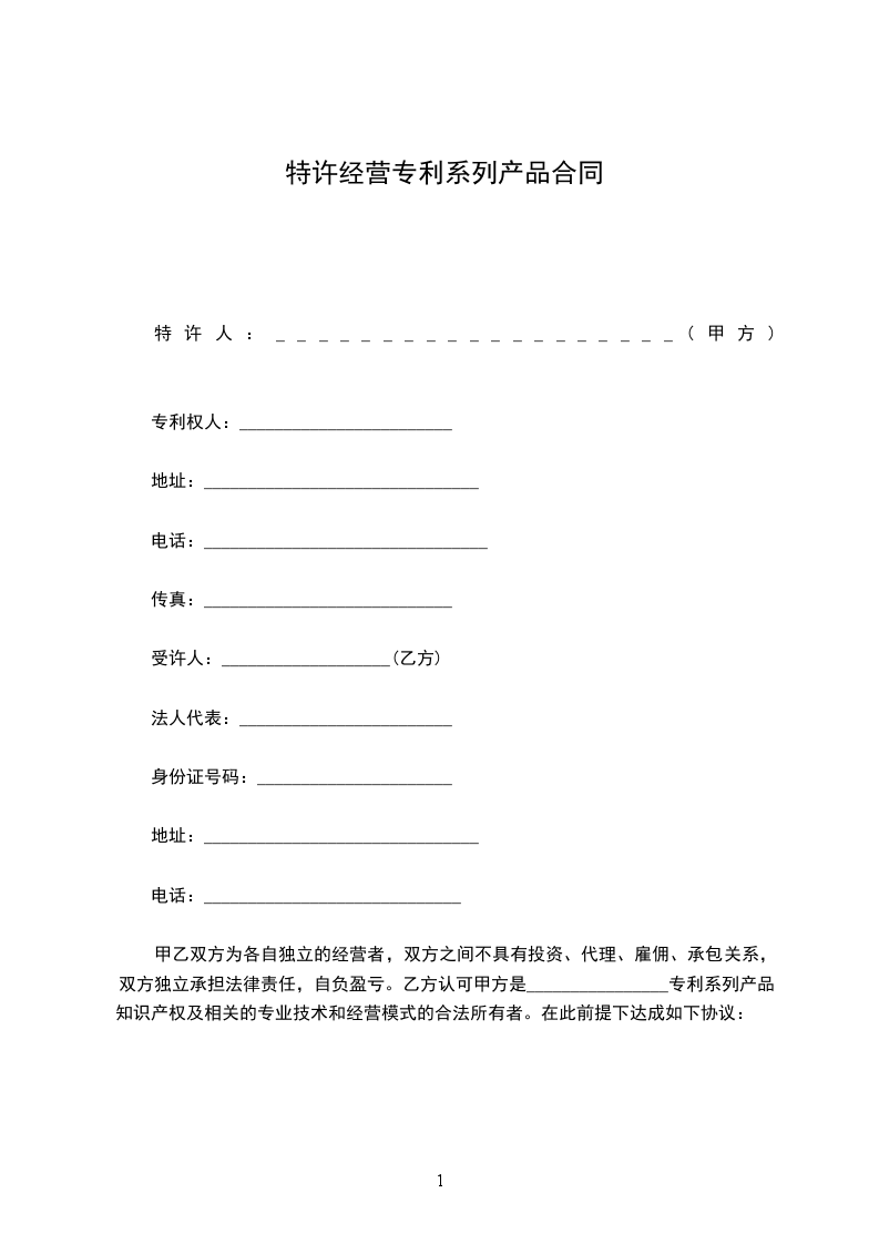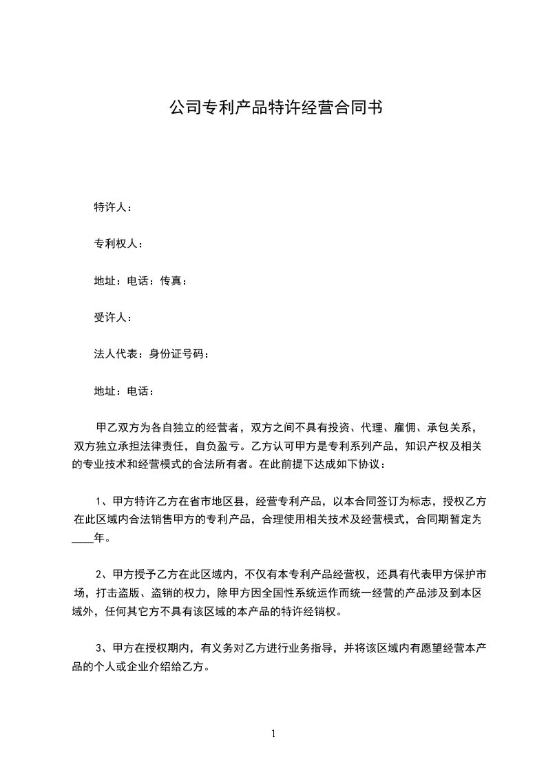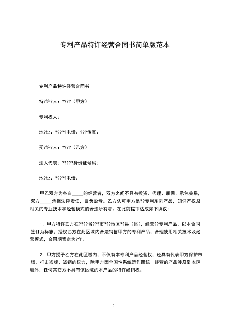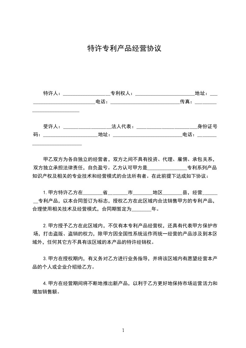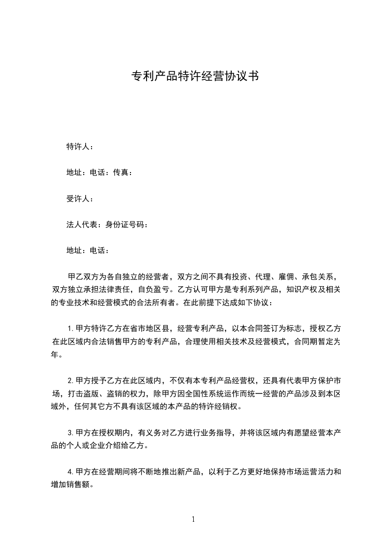 1.甲方特许乙方在????省???市???地区??县(区),经营??专利产品,以本合同签订为标志,授权乙方在此区域内合法销售甲方的专利产品,合理使用相关技术及经营模式,合同期暂定为?年。