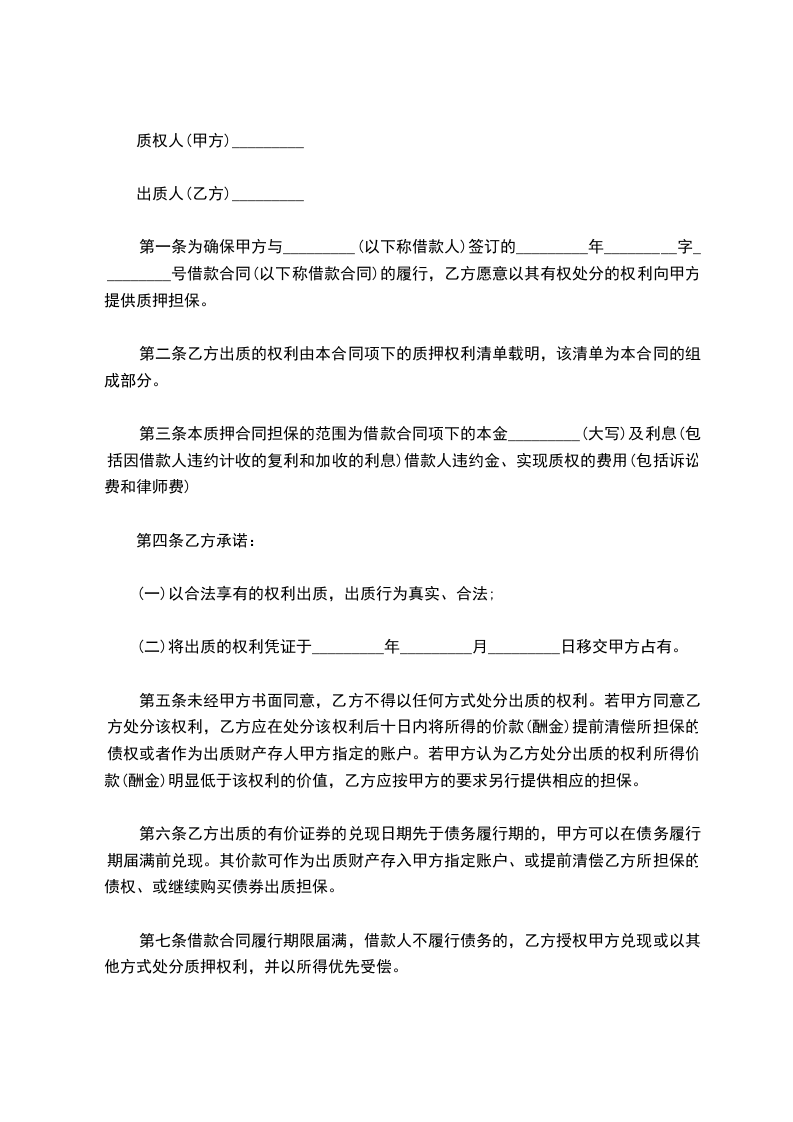 第一条为确保甲方与_________(以下称借款人)签订的_________年_________字_________号借款合同(以下称借款合同)的履行,乙方愿意以其有权处分的权利向甲方提供质押担保。