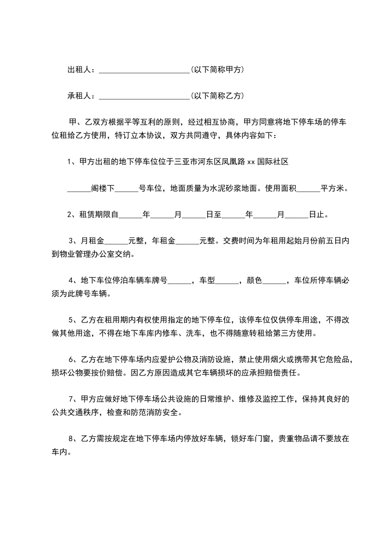 1、甲方出租的地下停车位位于三亚市河东区凤凰路xx国际社区