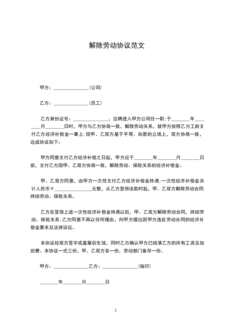 1、自_____年_____月_____日起,解除双方签订的劳动合同,双方的权利义务随之终止;