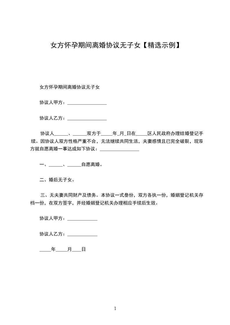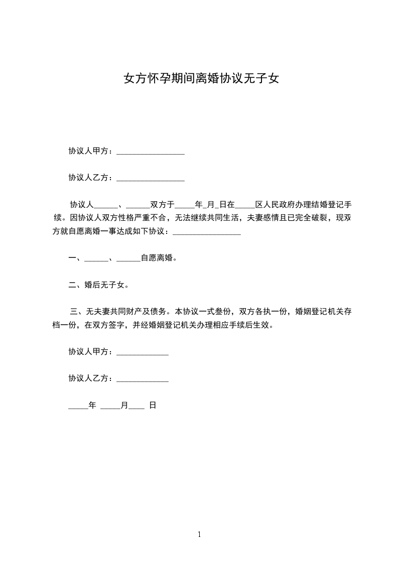 三、无夫妻共同财产及债务。本协议一式叁份,双方各执一份,婚姻登记机关存档一份,在双方签字,并经婚姻登记机关办理相应手续后生效。