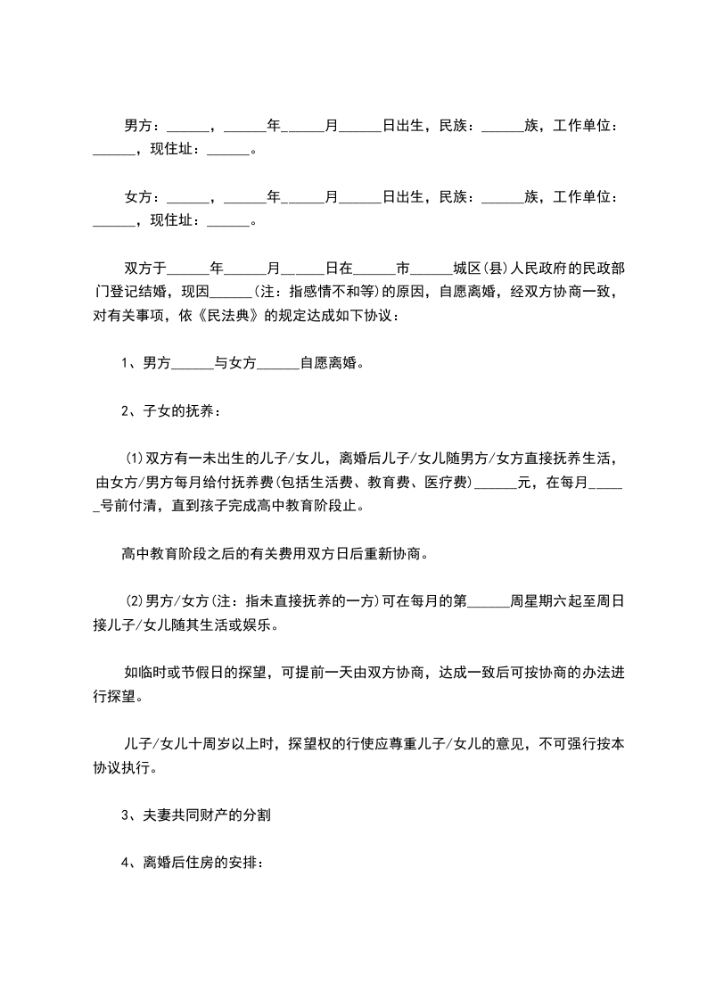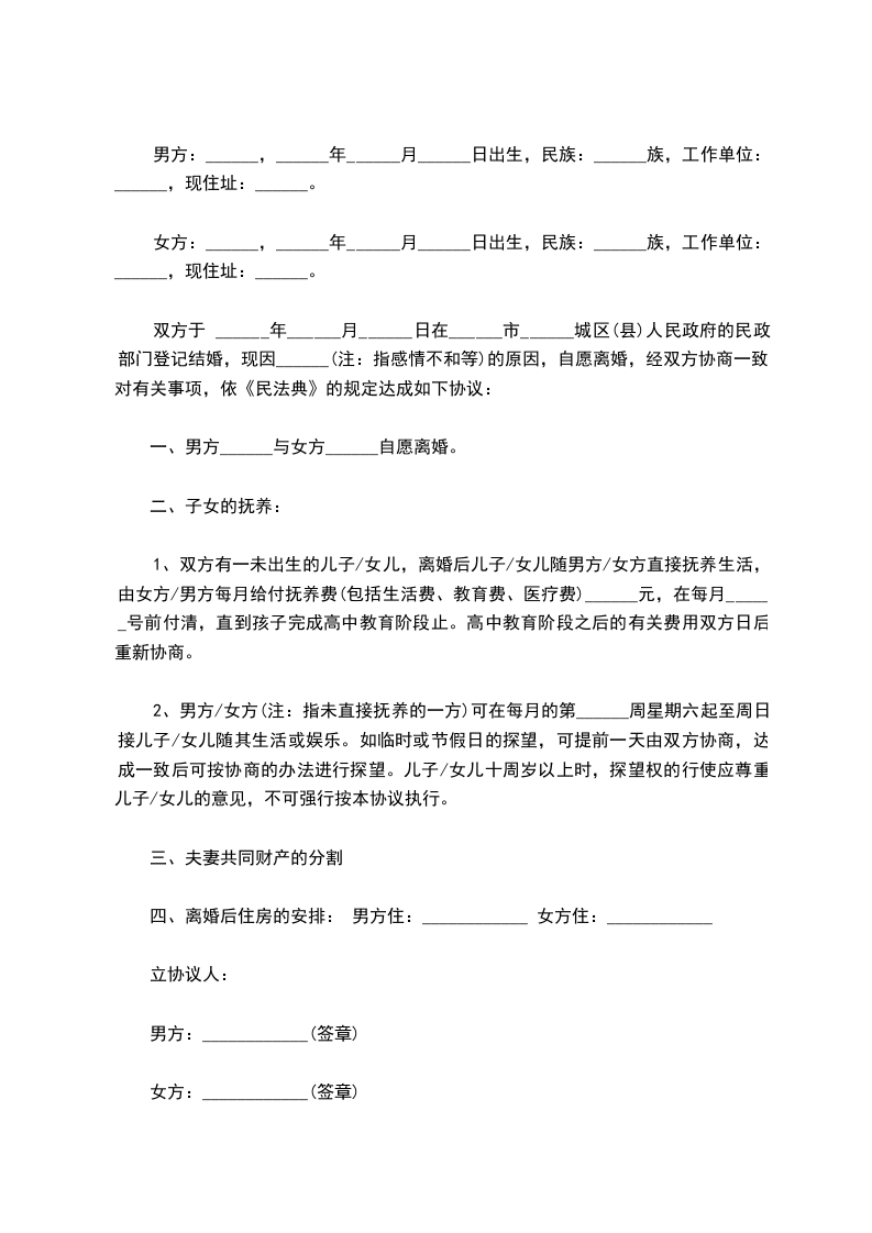 协议人______、______双方于_____年_月_日在_____区人民政府办理结婚登记手续。因协议人双方性格严重不合,无法继续共同生活,夫妻感情且已完全破裂,现双方就自愿离婚一事达成如下协议:_________________