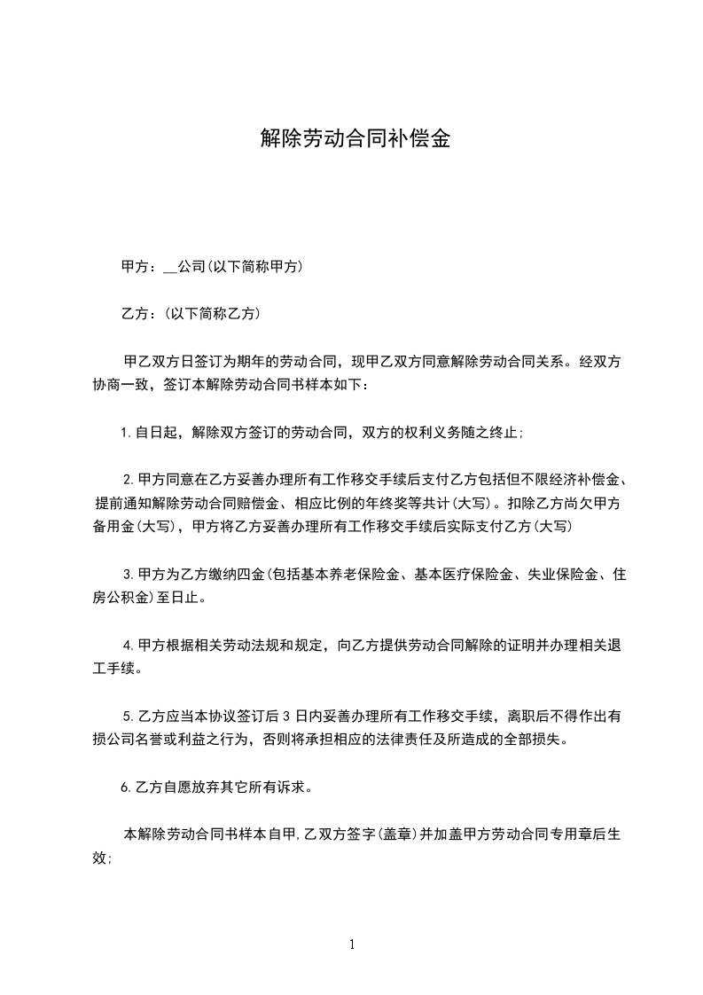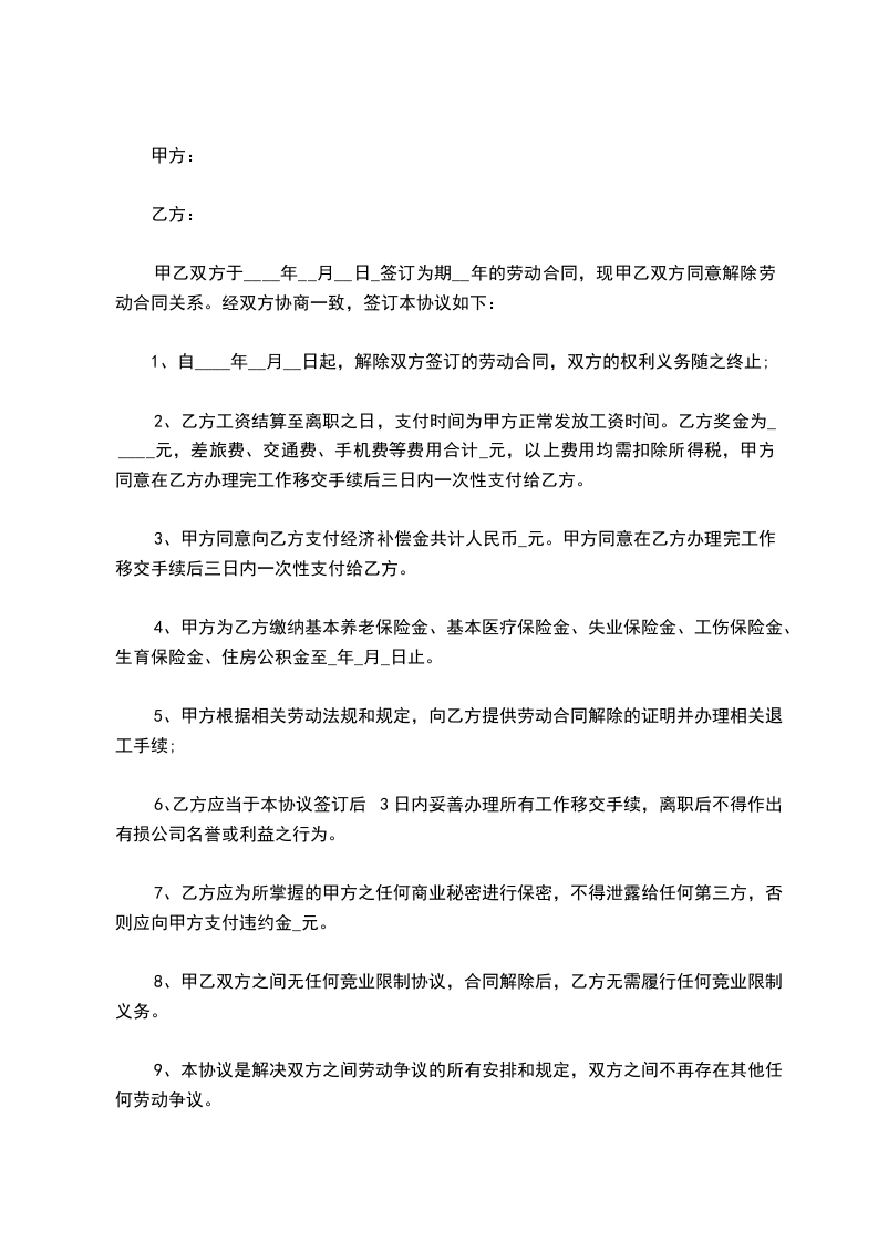 1.自______年____月____日起,解除双方签订的劳动合同,双方的权利义务随之终止;