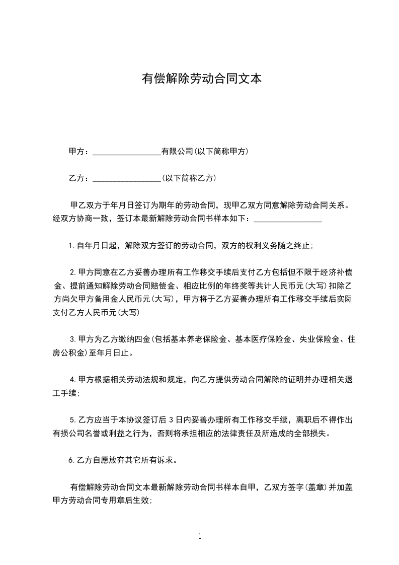 有偿解除劳动合同文本最新解除劳动合同书样本自甲,乙双方签字(盖章)并加盖甲方劳动合同专用章后生效;