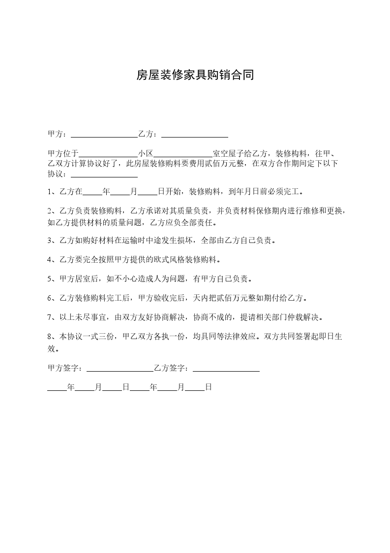 甲方:_________________乙方:_________________ 甲方位于_______________小区_______________室空屋子给乙方,装修构料,往甲、乙双方计算协议好了,此房屋装修购料要费用贰佰万元整,在双方合作期间定下以下协议:_________________ 1、乙方在_____年_____月_____日开始,装修购料,到_____年_____月_____日前必须完工。 2、乙方负责装修购料,乙方承诺对其质量负责,并负责材料保修期内进行维修和更换,如乙方提供材料的质量问题,乙方应负全部责任。 3、乙方如购好材料在运输时中途发生损坏,全部由乙方自己负责。 4、乙方要完全按照甲方提供的欧式风格装修购料。 5、甲方居室后,如不小心造成人为问题,有甲方自己负责。 6、乙方装修购料完工后,甲方验收完后,天内把贰佰万元整如期付给乙方。 7、以上未尽事宜,由双方友好协商解决,协商不成的,提请相关部门仲载解决。 8、本协议一式三份,甲乙双方各执一份,均具同等法律效应。双方共同签署起即日生效。 甲方签字:_________________乙方签字:_________________ _____年_____月_____日_____年_____月_____日