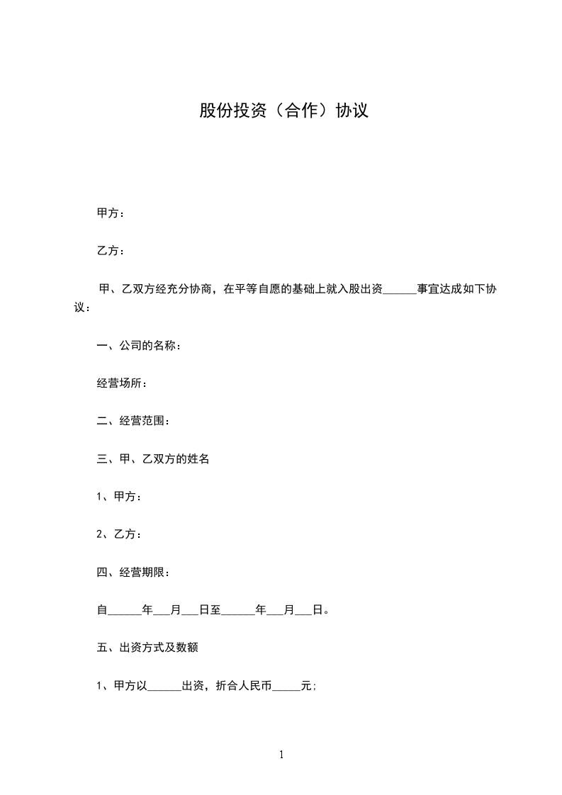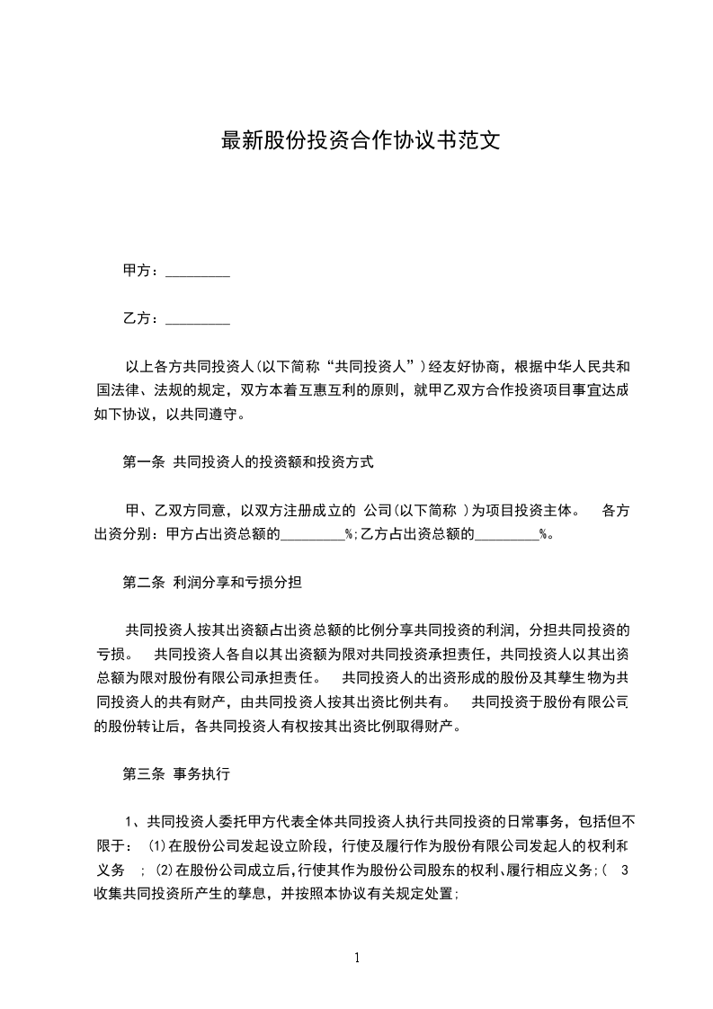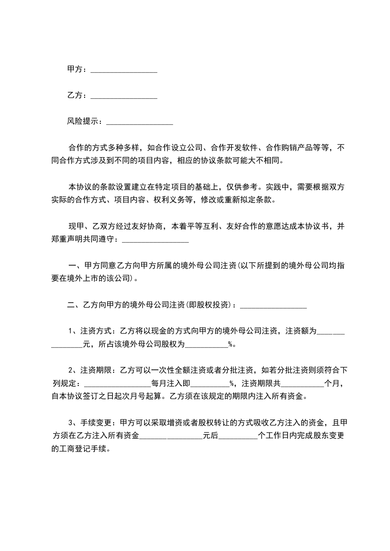 甲方:_________________ 乙方:_________________ 风险提示:_________________ 合作的方式多种多样,如合作设立公司、合作开发软件、合作购销产品等等,不同合作方式涉及到不同的项目内容,相应的协议条款可能大不相同。 本协议的条款设置建立在特定项目的基础上,仅供参考。实践中,需要根据双方实际的合作方式、项目内容、权利义务等,修改或重新拟定条款。 现甲、乙双方经过友好协商,本着平等互利、友好合作的意愿达成本协议书,并郑重声明共同遵守:_________________ 一、甲方同意乙方向甲方所属的境外母公司注资(以下所提到的境外母公司均指要在境外上市的该公司)。 二、乙方向甲方的境外母公司注资(即股权投资):_________________ 1、注资方式:乙方将以现金的方式向甲方的境外母公司注资,注资额为_______________元,所占该境外母公司股权为___________%。 2、注资期限:乙方可以一次性全额注资或者分批注资,如若分批注资则须符合下列规定:_________________每月注入即__________%,注资期限共___________个月,自本协议签订之日起次月号起算。乙方须在该规定的期限内注入所有资金。 3、手续变更:甲方可以采取增资或者股权转让的方式吸收乙方注入的资金,且甲方须在乙方注入所有资金________________元后__________个工作日内完成股东变更的工商登记手续。 4、股权的排他性和无瑕疵:_________________甲方保证对其拟增发或转让给乙方的股权拥有完全处分权,保证该股权没有设定质押,保证股权未被查封,没有工商、税务问题,并免遭第三人追索,否则甲方应当承担由此引起一切经济和法律责任。 5、费用承担:在本次股权投资过程中,发生的相关费用(如见证、审计、工商变更等),由甲方承担。 6、违约责任:_________________ 如乙方不能按期支付股权投资款,每逾期一天,应向甲方支付逾期部分转让款的万分之_______________的违约金。如因乙方违约给甲方造成损失,乙方支付的违约金金额低于实际损失的,乙方必须另给予以补偿。 如甲方不能如期办理变更登记,或者严重影响乙方实现订立本协议书的目的,甲方应按照乙方已经支付的股权投资款的万分之___________向乙方支付违约金。如因甲方违约给乙方造成损失,甲方支付的违约金金额低于实际损失的,甲方必须另给予以补偿。 7、退出机制:_________________如若甲方的境外母公司最终没有在境外成功上市,乙方须向甲方按乙方的实际注资额转让所占该境外母公司的股权。 三、甲方的其他责任:_________________ 1、甲方应指定专人及时、合理地向乙方提供乙方在履行咨询服务过程中所必须的证件和法律文件资料。 2、甲方对其提供的一切证件和法律文件资料的真实性、正确性、合法性承担全部责任。 四、乙方的其他责任:_________________ 1、乙方应遵守国家有关法律、法规,依照规定从事企业信息咨询服务工作。 2、乙方对甲方提供的证件和资料负有妥善保管和保密责任,乙方不得将证件和资料提供给与本次咨询服务无关的其他第三者。 五、乙方根据甲方提供的信息撰写材料,甲方确认无误后签名盖章,意味着甲方认可乙方撰写的材料符合甲方的真实情况,并对申请材料的真实性负全部责任,如果因为材料不真实造成的一切后果,均由甲方承担,与乙方无关。 六、由于不可抗力因素,如火灾,水灾等自然灾害或者罢工、强制措施、政府政策变更等原因而影响本协议的执行,双方不负违约责任,根据事故影响的时间可将协议履行时间相应延长,并由甲乙双方协商补救措施。 七、甲乙双方在执行协议中发生的一切争执应通过双方友好协商解决。 八、协议的生效及其它:_________________ 1、本协议签字盖章和授权代表签字后即时生效。协议正本一式__________份,甲乙双方各执___________份,具有同等效力。 2、本协议未尽事宜由甲乙双方另行协商。 甲方(签章):_________________ 授权代表人(签字):_________________ 协议书签订地点:_________________ _______________年__________月__________日 乙方(签章):_________________ 授权代表人(签字):_________________ 协议书签订地点:_________________ _______________年__________月__________日