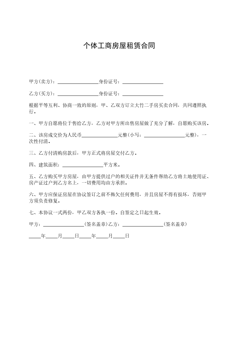 甲方(卖方):_________________身份证号:_________________ 乙方(买方):_________________身份证号:_________________ 根据平等互利、协商一致的原则,甲、乙双方订立大竹二手房买卖合同,共同遵照执行。 一、甲方自愿将位于售给乙方,乙方对甲方所出售房屋做了充分了解,自愿购买该房。 二、该房成交价为人民币_______________元整(小写:_________________元整),一次性付清。 三、乙方付清购房款后,甲方正式将房屋交付乙方。 四、建筑面积:_________________平方米。 五、乙方购买甲方房屋,由甲方提供过户的相关证件并无条件帮助乙方将土地使用证、房产证过户到乙方名上,一切费用均由方承担。 六、甲方应保证房屋在协议签订之前不拖欠任何费用,并且房屋不得有损坏,否则甲方须负责修复。 七、本协议一式两份,甲乙双方各执一份。自签定之日起生效。 甲方:_________________(签名盖章)乙方:_________________(签名盖章) _____年_____月_____日_____年_____月_____日