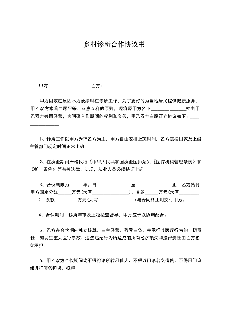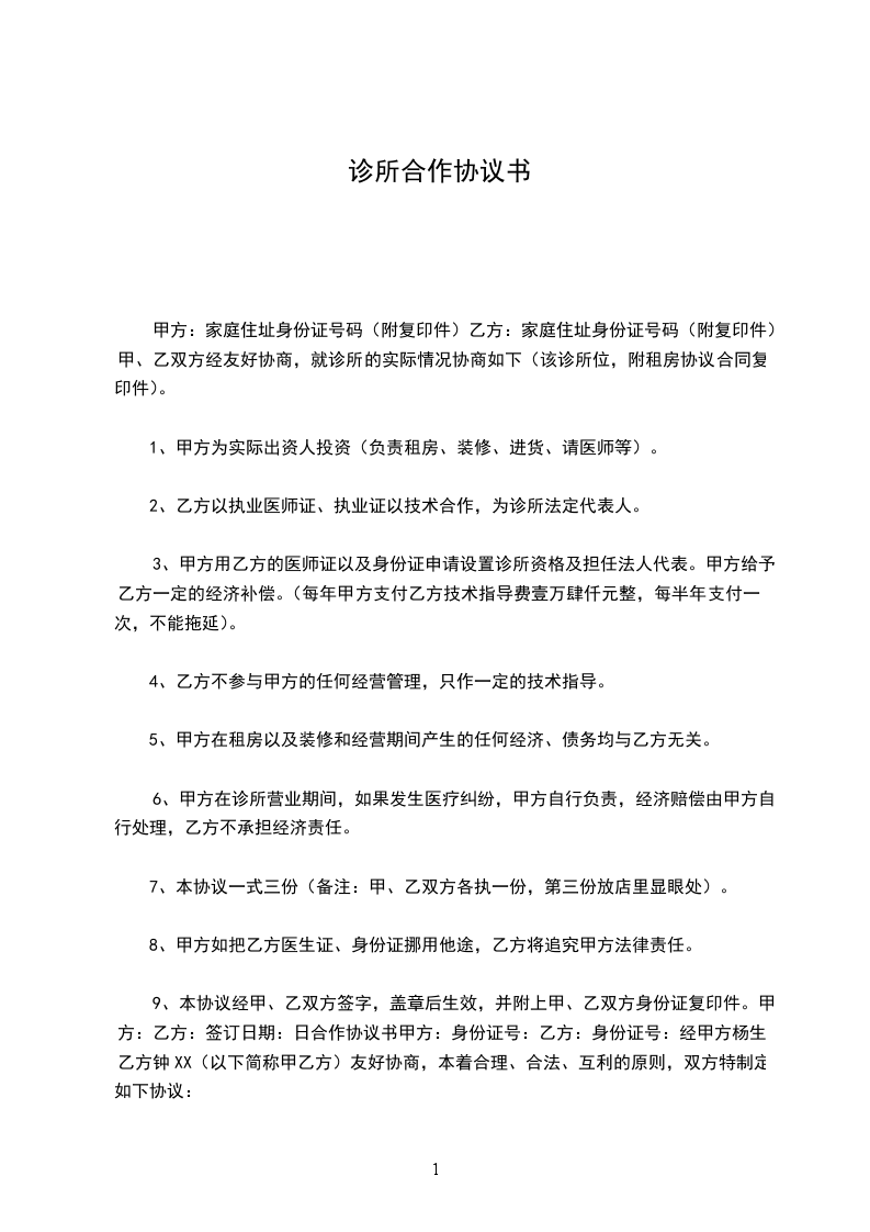甲方因家庭原因不方便按时在诊所工作,为了更好的为当地居民提供健康服务,甲乙双方本着自愿平等、互惠互利的原则,现将原甲方名下_______________交由甲乙双方共同经营,为明确合作期间的权利和义务,甲乙双方自愿订立协议如下:_________________