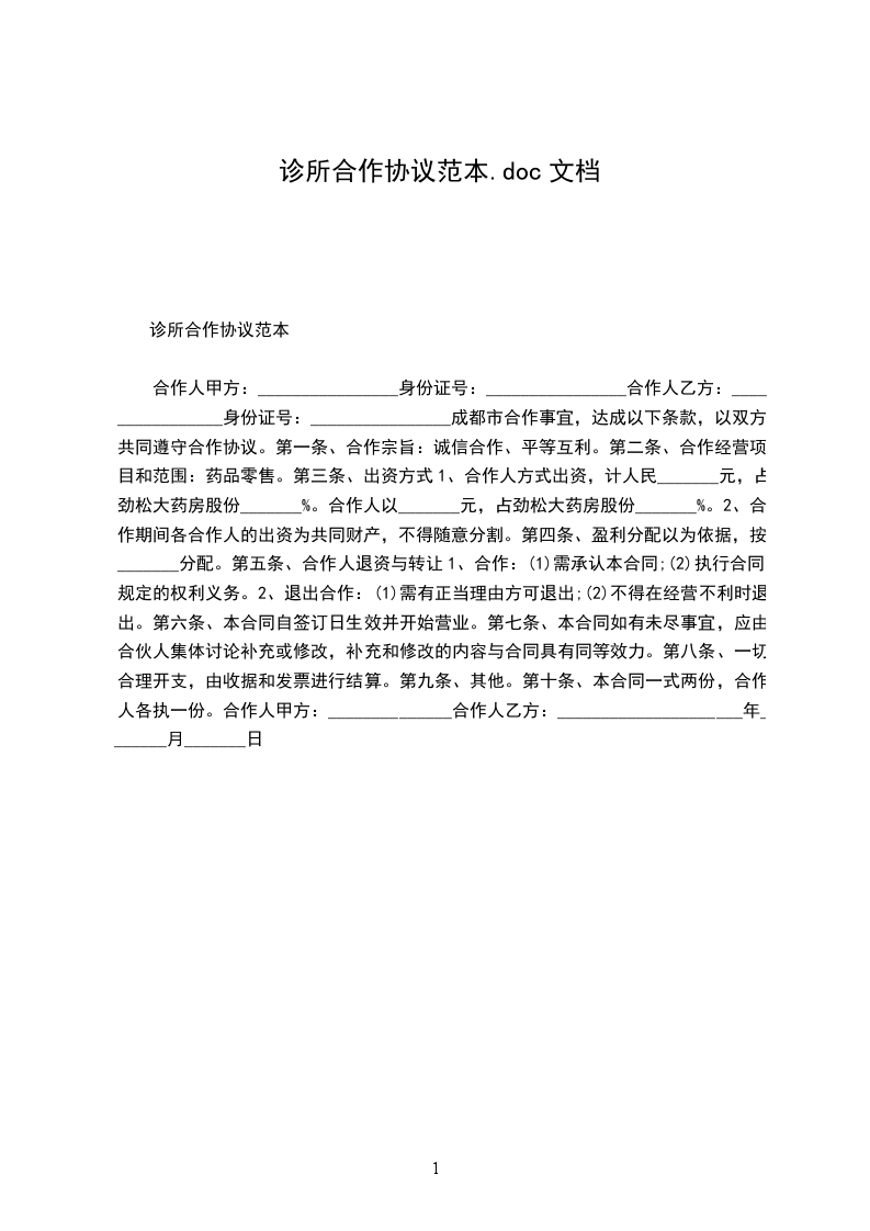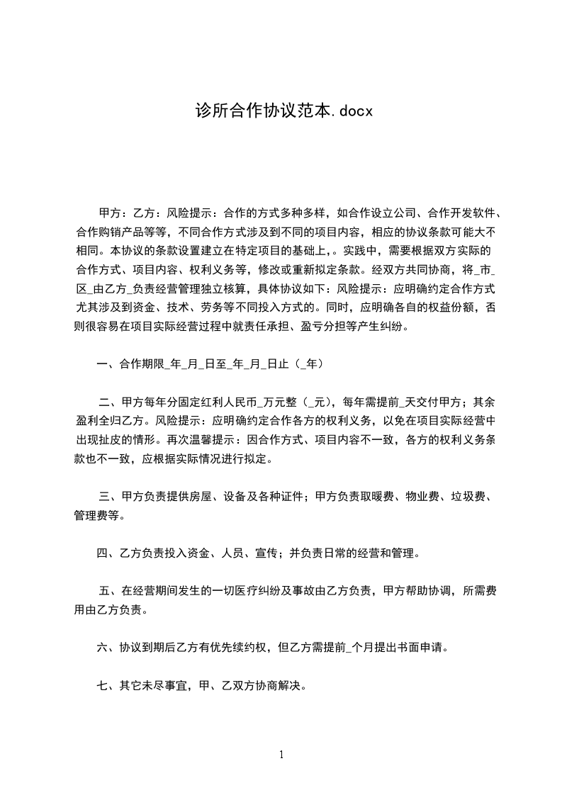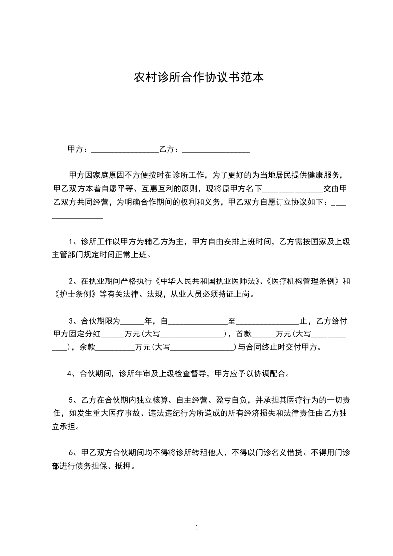 甲方因家庭原因不方便按时在诊所工作,为了更好的为当地居民提供健康服务,甲乙双方本着自愿平等、互惠互利的原则,现将原甲方名下_______________交由甲乙双方共同经营,为明确合作期间的权利和义务,甲乙双方自愿订立协议如下:_________________