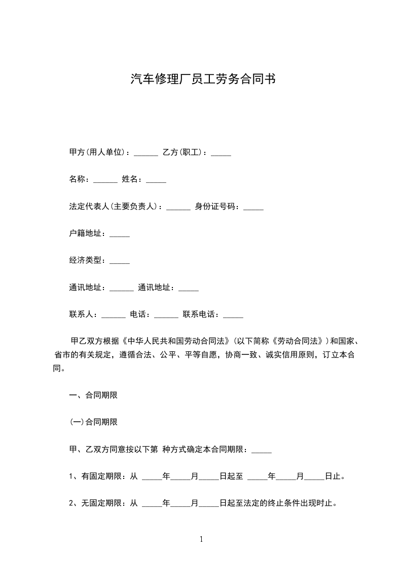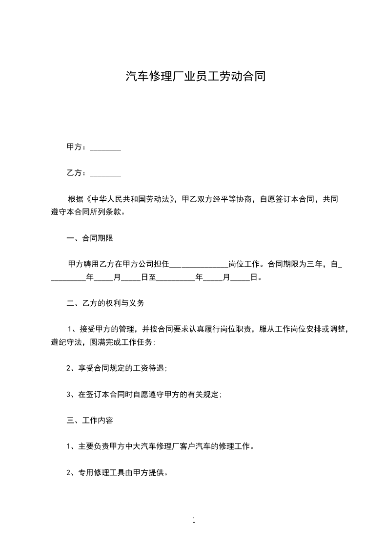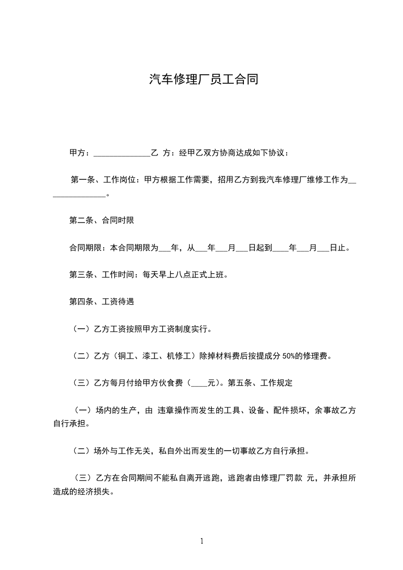 甲方:______________ 乙方:______________ 经甲乙双方协商达成如下协议: 第一条、工作岗位:甲方根据工作需要,招用乙方到我汽车修理厂维修工作为__________。 第二条、合同时限 合同期限:本合同期限为年,从_____年_____月_____日起到年_____月日止。 第三条、工作时间:每天早上八点正式上班。 第四条、工资待遇 (一)乙方工资按照甲方工资制度实行。 (二)乙方(铜工、漆工、机修工)除掉材料费后按提成分50%的修理费。 (三)乙方每月付给甲方伙食费(______________元) 第五条、工作规定 (一)场内的生产,由于违章操作而发生的工具、设备、配件损坏,余事故乙方自行承担。 (二)场外与工作无关,私自外出而发生的一切事故乙方自行承担。 (三)乙方在合同期间不能私自离开逃跑,逃跑者由修理厂罚款2000元,并承担所造成的经济损失。 (四)在合同期乙方不能私自外出去做任何事业。 (五)乙方不能使用任何毒|品。 (六)乙方不能贪|污、偷盗场内的任何财物和金钱等。 (七)乙方必须按照甲方指定的工作做出效益。 (八)乙方晚上12点以前必须回到修理厂休息。 (九)乙方不能透露修理厂的秘密。 第六条、甲方责任 甲方不能拖延乙方的工资,由每月的月底付清乙方。乙方若发生特殊情况,甲方必须尽量帮助解决。 双方应遵守国家规定的相关法律法规,望双方共同遵守。此协议一式二份,甲方双方各持一份,双方签字后生效。 甲方签字:______________ 乙方签字:______________ 年_____月_____日