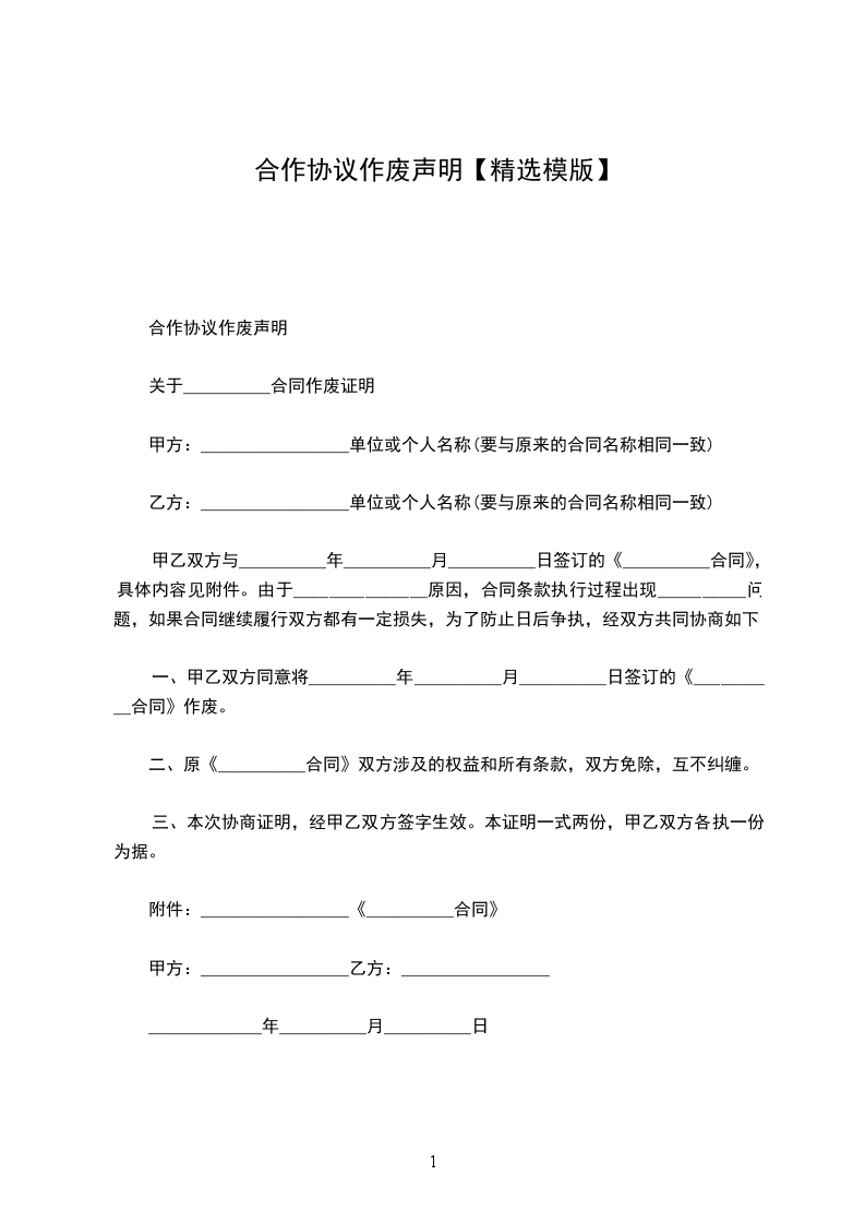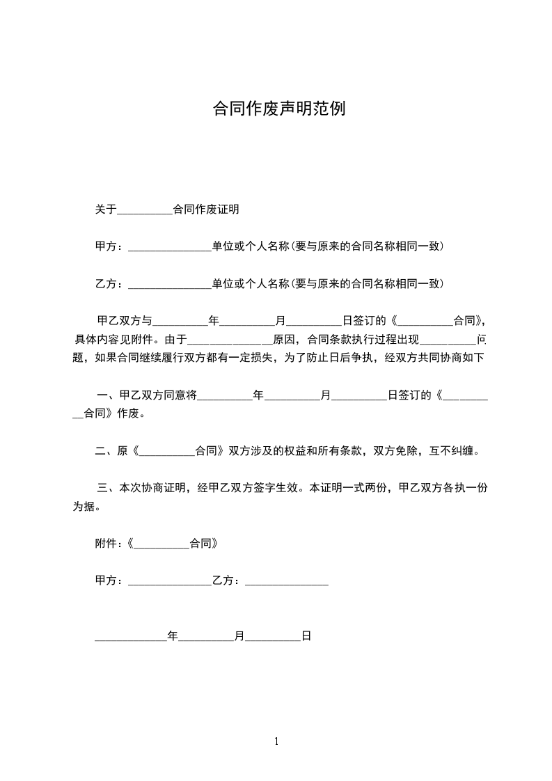 一、甲乙双方同意将__________年__________月__________日签订的《__________合同》作废。