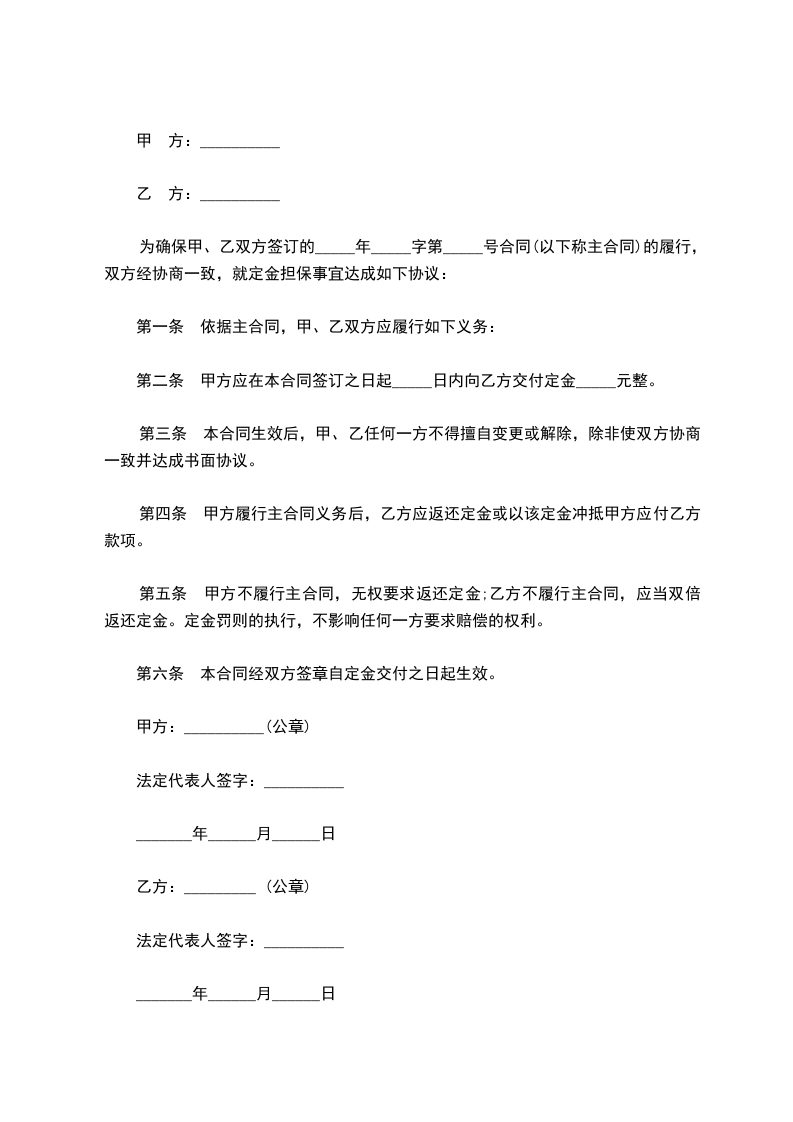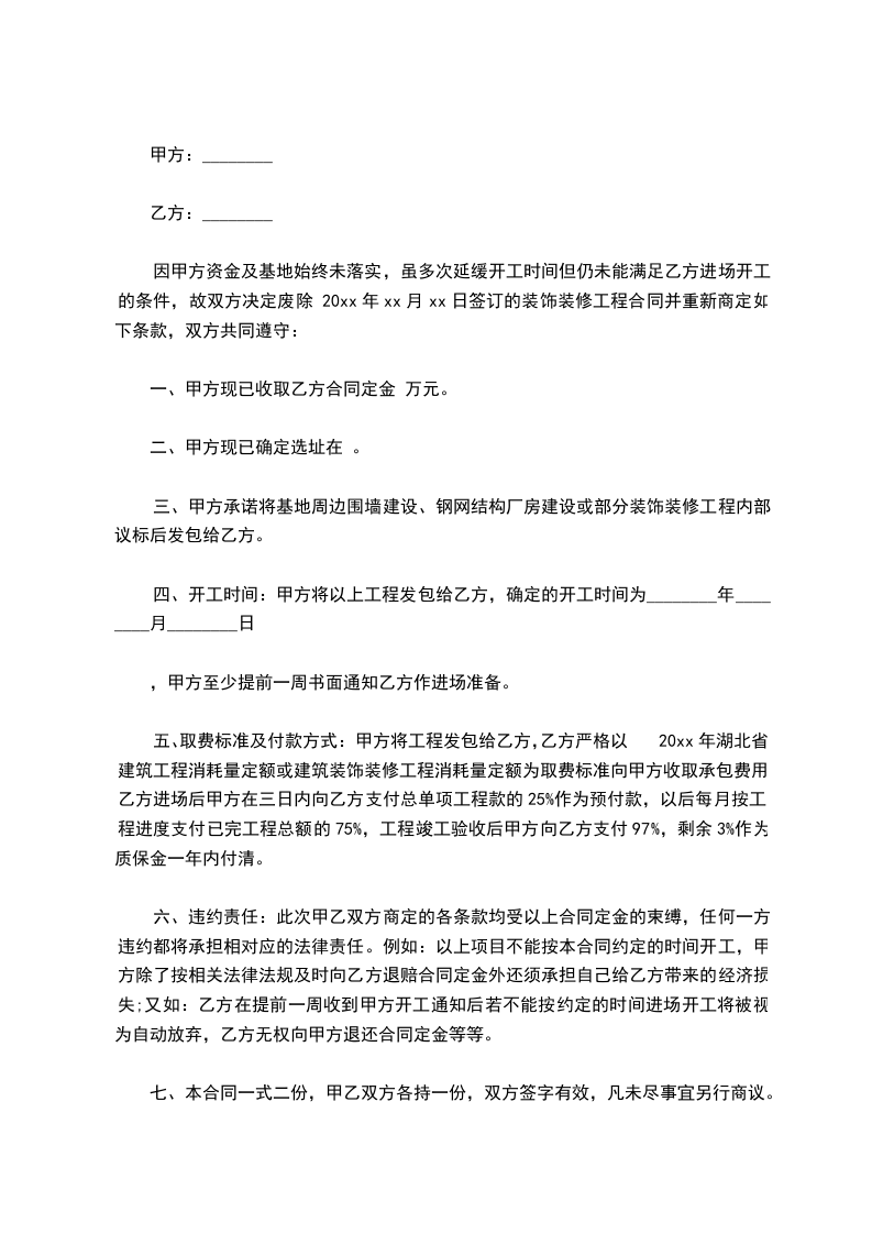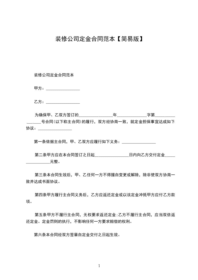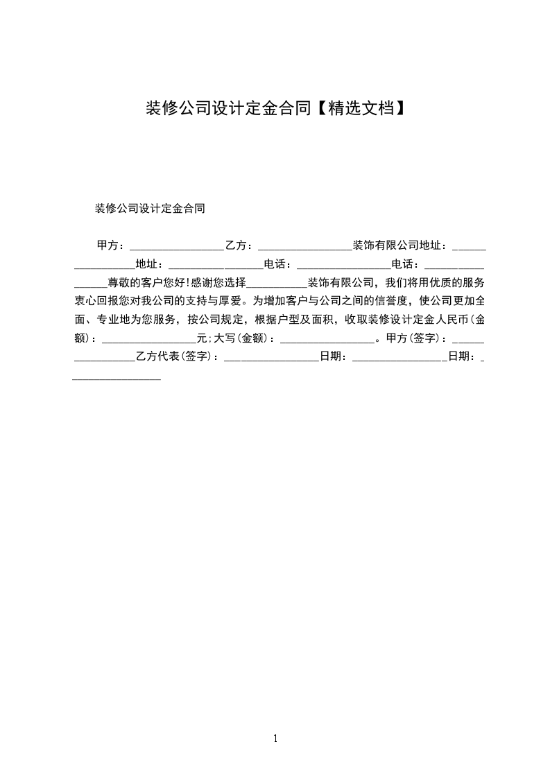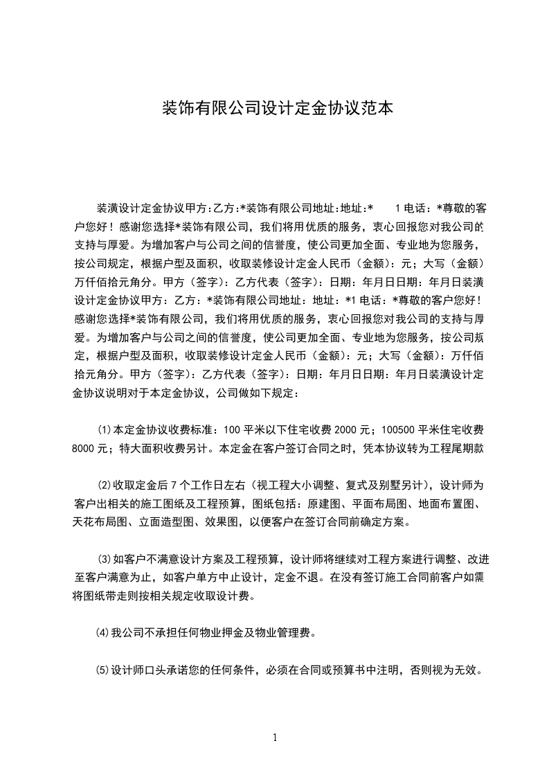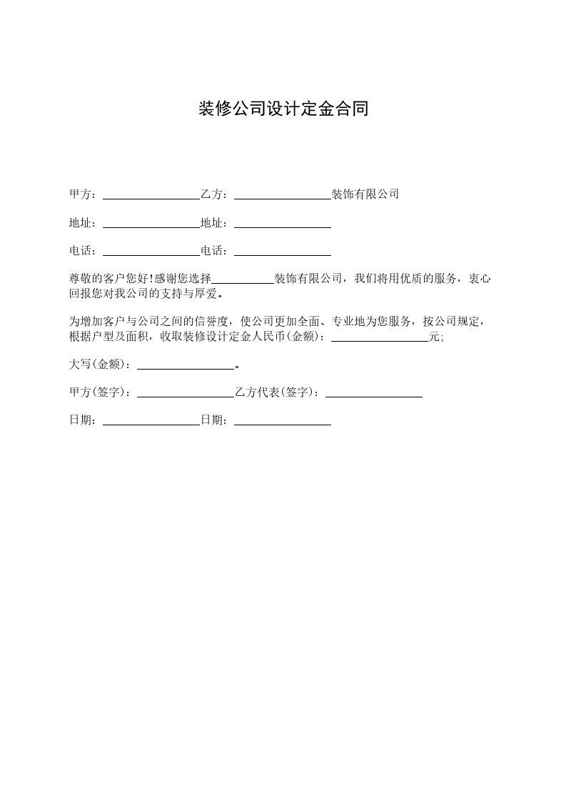 甲方:_________________乙方:_________________装饰有限公司 地址:_________________地址:_________________ 电话:_________________电话:_________________ 尊敬的客户您好!感谢您选择___________装饰有限公司,我们将用优质的服务,衷心回报您对我公司的支持与厚爱。 为增加客户与公司之间的信誉度,使公司更加全面、专业地为您服务,按公司规定,根据户型及面积,收取装修设计定金人民币(金额):_________________元; 大写(金额):_________________。 甲方(签字):_________________乙方代表(签字):_________________ 日期:_________________日期:_________________
