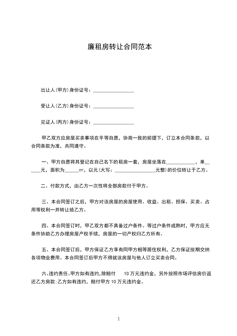 一、甲方自愿将其登记在自己名下的租房一套,房屋坐落在____________,单______元,面积为______㎡,以元(大写:_________________元整)的价位转让于乙方。