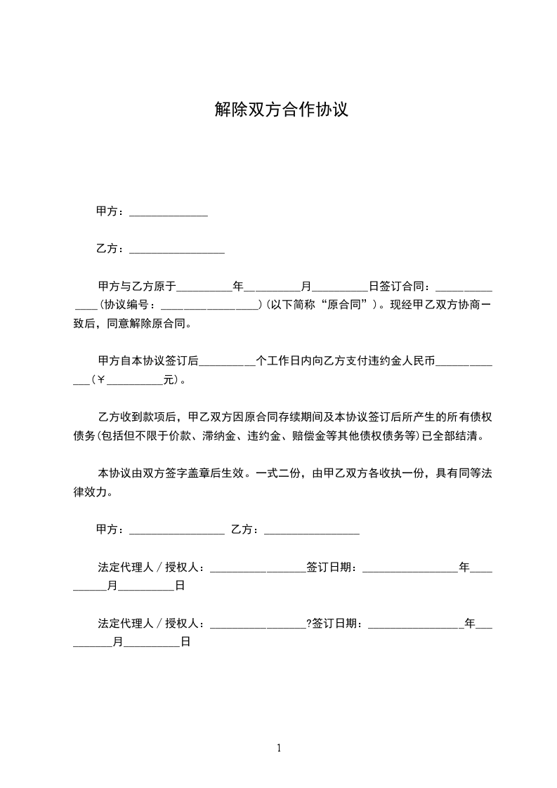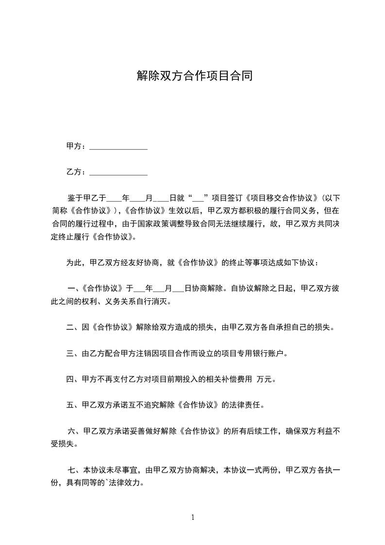 甲方与乙方原于__________年__________月__________日签订合同:______________(协议编号:_________________)(以下简称“原合同”)。现经甲乙双方协商一致后,同意解除原合同。